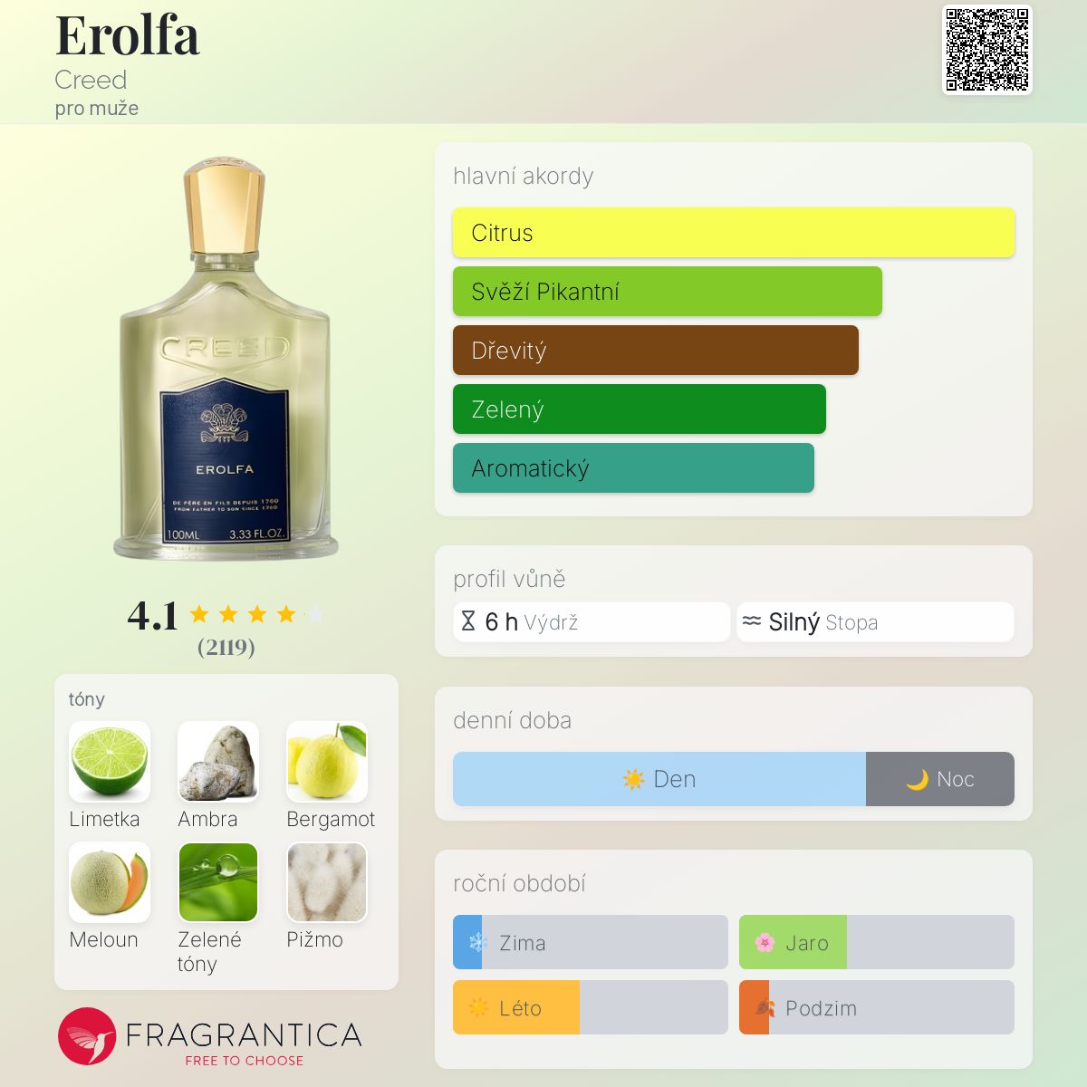 Vytvořením Erolfy dům Creed nepochybně identifikoval potenciál "DNA" této nádherné vůně, která je po pěti plných použitích a od prvního použití rozpoznatelná aromatickými kříženci s SMW a Millesime imprerial, o tom není pochyb.