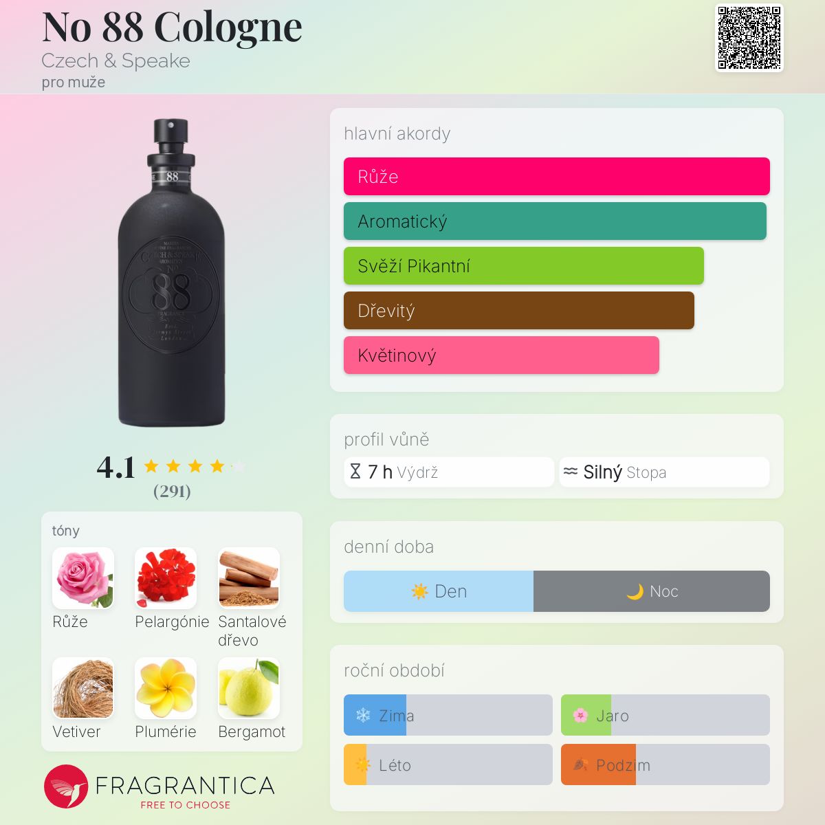 No 88 Cologne podle Czech & Speake je Woody Aromatic vůně pro muže. No 88 Cologne byl/a uveden/a v roce 1980. "Nosem" za touto vůní je John Stephen. Vrchní tón je Bergamot ; střední tóny jsouRůže, Pelargónie, Plumérie, Trnovník akát a Kasie ; základní tóny jsou Santalové dřevo a Vetiver.