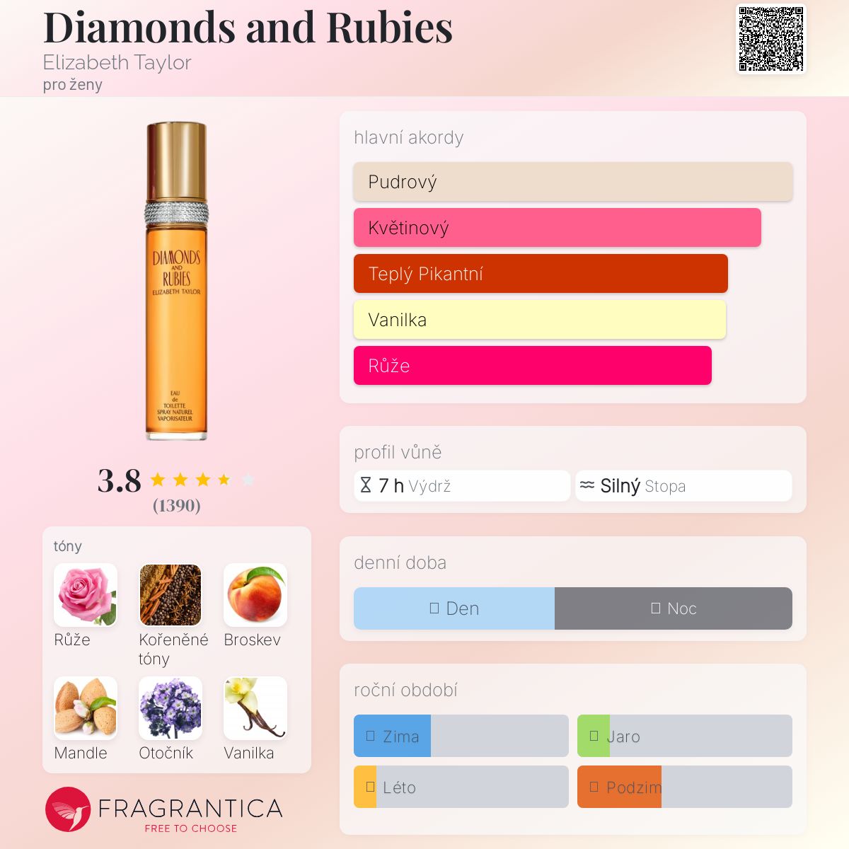 Diamonds and Rubies podle Elizabeth Taylor je Orientální Floral vůně pro ženy. Diamonds and Rubies byl/a uveden/a v roce 1993. "Nosem" za touto vůní je Sophia Grojsman. Vrchní tóny jsou Červená růže, Broskev, Mandlové dřevo, Šeřík a Lilie; střední tóny jsouRůže, Koření, Otočník, Ylang-Ylang, Orchidej, Jasmín a Konvalinka ; základní tóny jsou Vanilka, Santalové dřevo, Benzoin, Jantar (ambra), Pižmo a Cedr.