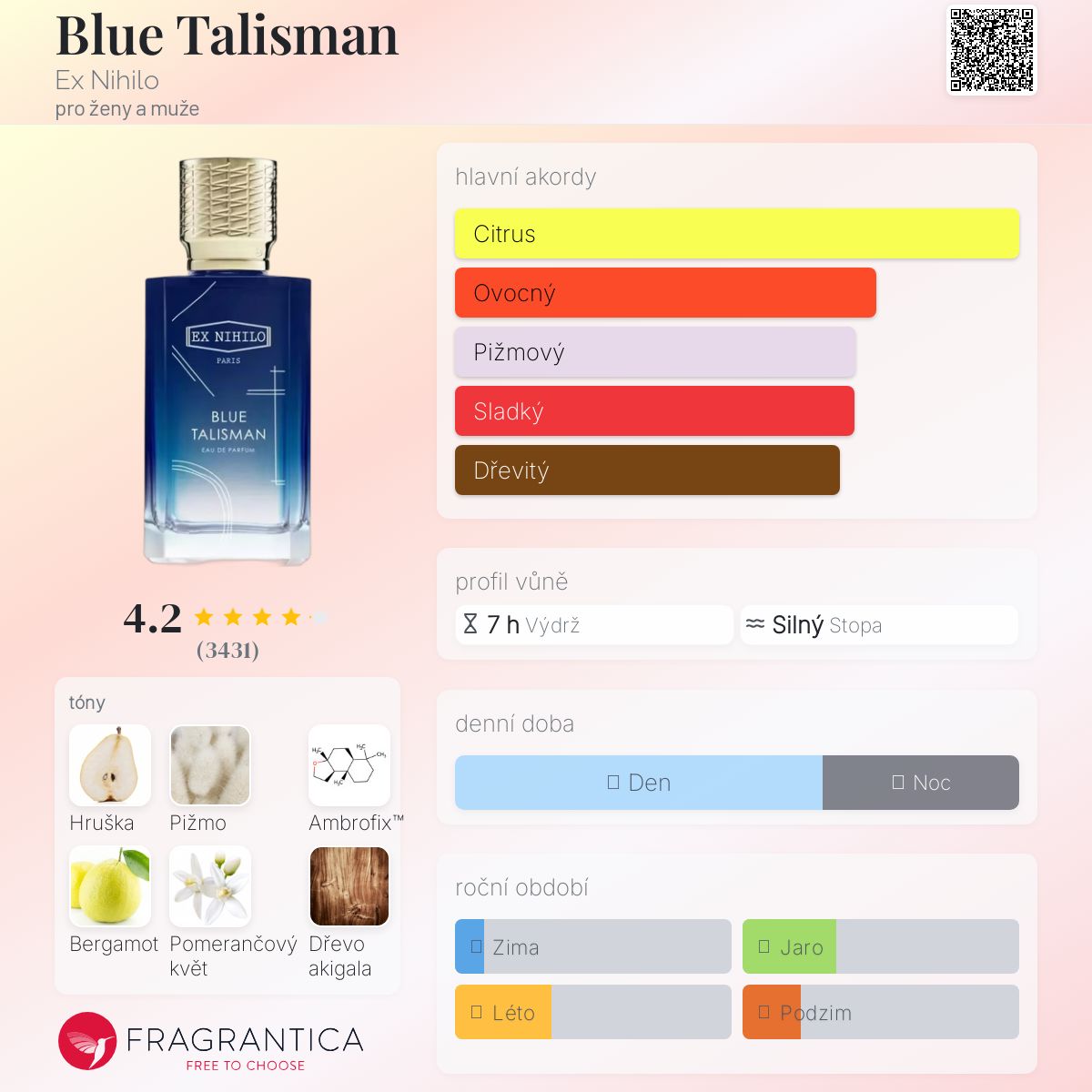 Blue Talisman podle Ex Nihilo je vůně pro ženy a muže. Blue Talisman byl/a uveden/a v roce 2023. "Nosem" za touto vůní je Jordi Fernández. Vrchní tóny jsou Hruška, Bergamot, Mandarinka a Zázvor; střední tóny jsouPomerančový květ a Georgywood ; základní tóny jsou Pižmo, Ambrofix™, Dřevo akigala a Cedr.