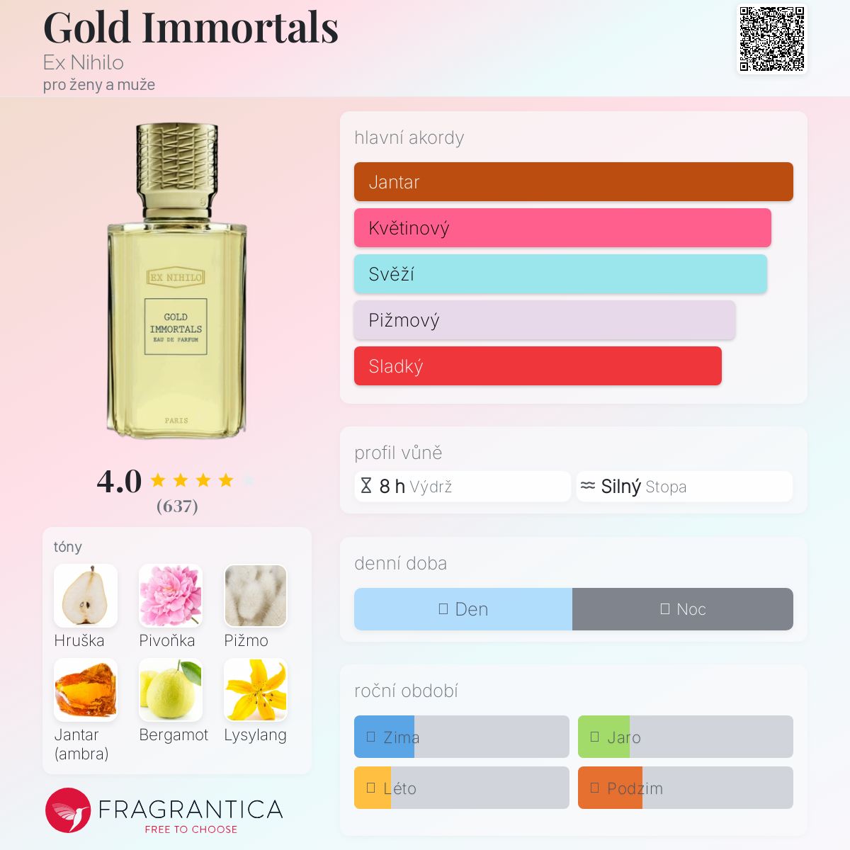 Gold Immortals podle Ex Nihilo je Orientální Floral vůně pro ženy a muže. Gold Immortals byl/a uveden/a v roce 2020. "Nosem" za touto vůní je Jordi Fernández. Vrchní tóny jsou Hruška a Bergamot; střední tóny jsouPivoňka a Lysylang ; základní tóny jsou Pižmo, Jantar (ambra) a Fazole tonka.