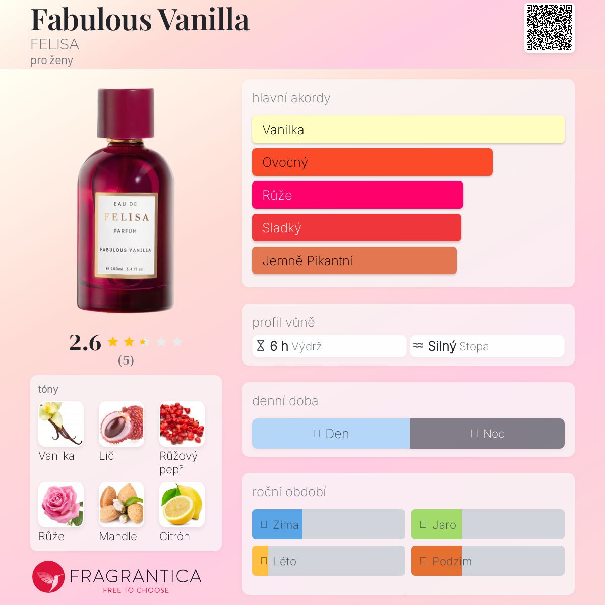 Fabulous Vanilla podle FELISA je Orientální Floral vůně pro ženy. Fabulous Vanilla byl/a uveden/a v roce 2023. "Nosem" za touto vůní je Tamara Mannina. Vrchní tóny jsou Liči, Růžový pepř a Citrón; střední tóny jsouVanilka, Růžový olej a Mandle ; základní tóny jsou Vanilka, Jantar (ambra) a Vetiver.