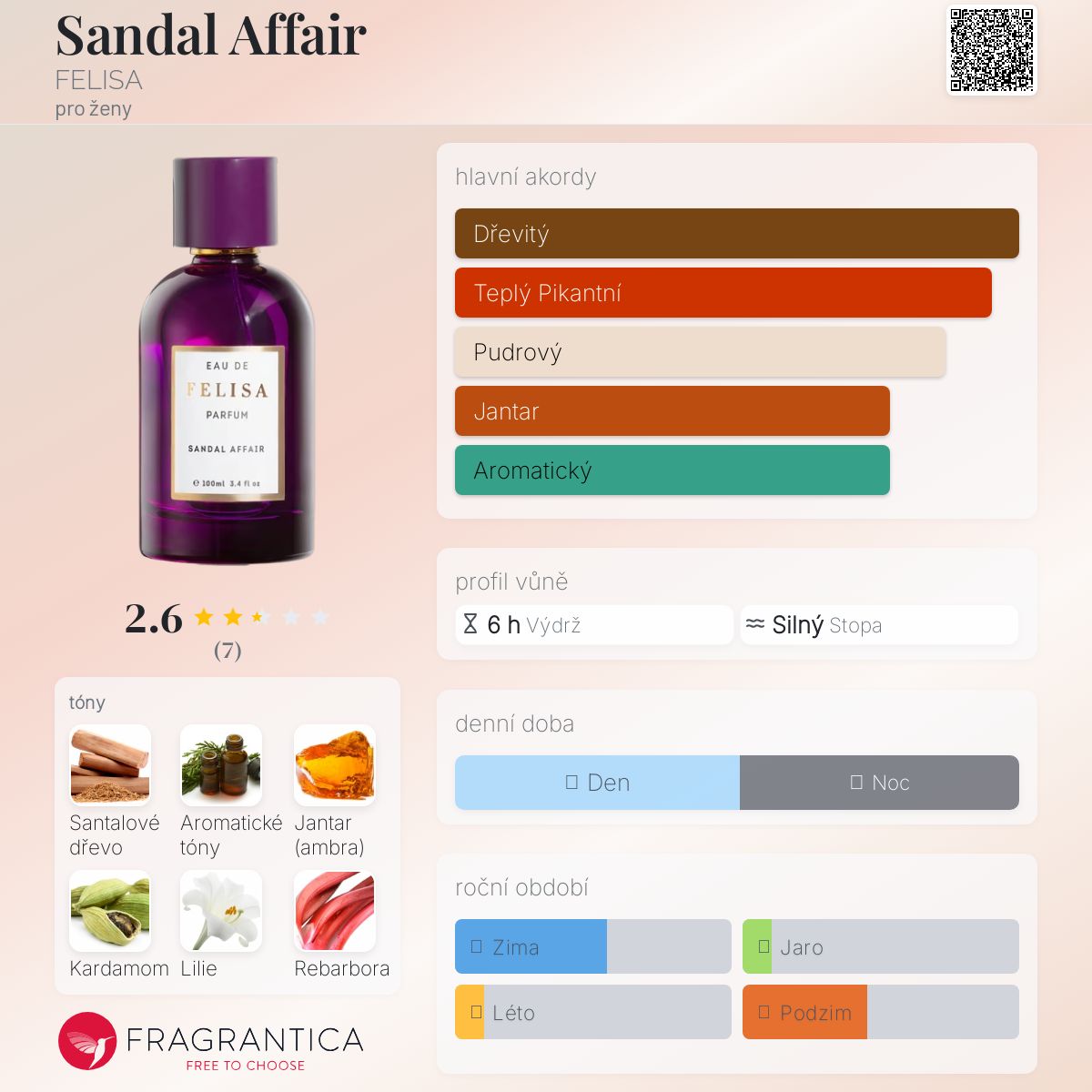 Sandal Affair podle FELISA je Orientální Woody vůně pro ženy. Sandal Affair byl/a uveden/a v roce 2023. "Nosem" za touto vůní je Tamara Mannina. Vrchní tóny jsou Kardamom, Rebarbora a Bergamot; střední tóny jsouAromatické tóny, Lilie a Fialkový list ; základní tóny jsou Santalové dřevo, Jantar (ambra) a Pižmo.