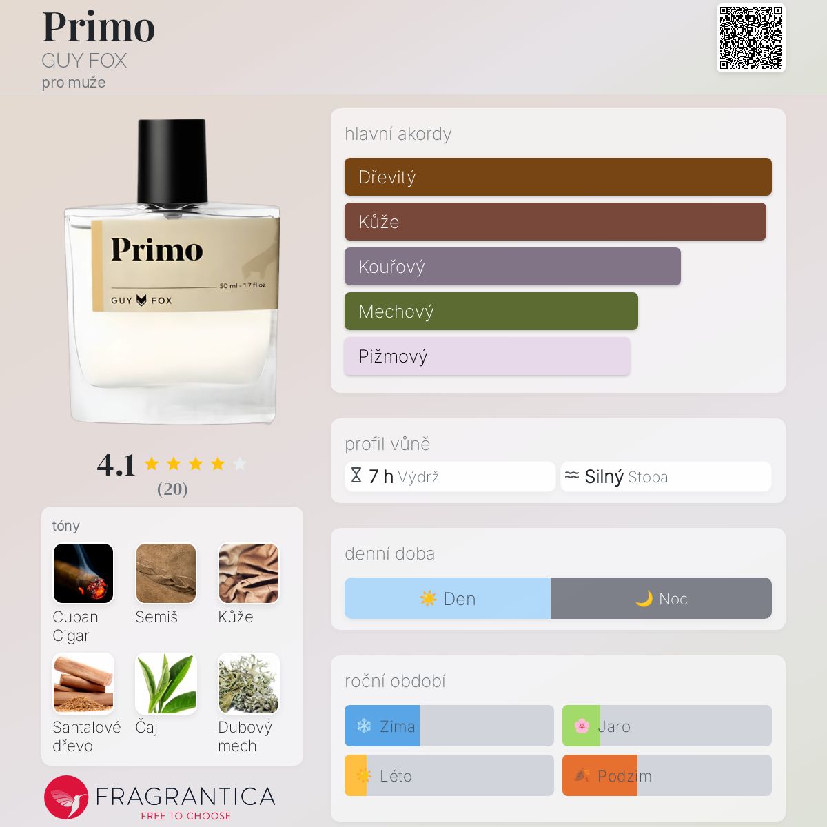 Primo podle GUY FOX je Leather vůně pro muže. Toto je nová vůně. Primo byl/a uveden/a v roce 2024. "Nosem" za touto vůní je Sidonie Grandperret. Vrchní tóny jsou Santalové dřevo, Černý čaj a Kašmírové dřevo; střední tóny jsouKubánský doutník, Semiš, Kůže a Mléko ; základní tóny jsou Dubový mech, Kouř, Rum a Jemný jantar (ambra).