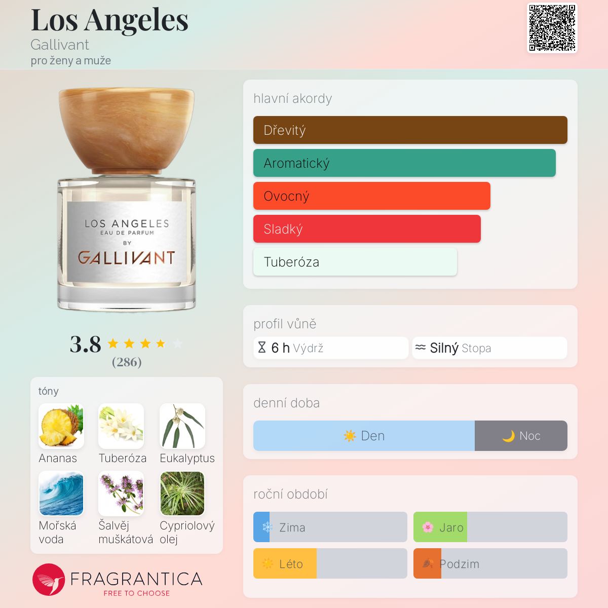 Los Angeles podle Gallivant je Woody Aromatic vůně pro ženy a muže. Los Angeles byl/a uveden/a v roce 2019. "Nosem" za touto vůní je Karine Chevallier. Vrchní tóny jsou Ananas, Eukalyptus, Šalvěj muškátová a Mandarinka; střední tóny jsouTuberóza, Mořské tóny a Narcis ; základní tóny jsou Cypriolový olej, Pižmo, Cade olej, Guajakové dřevo a Otočník.
