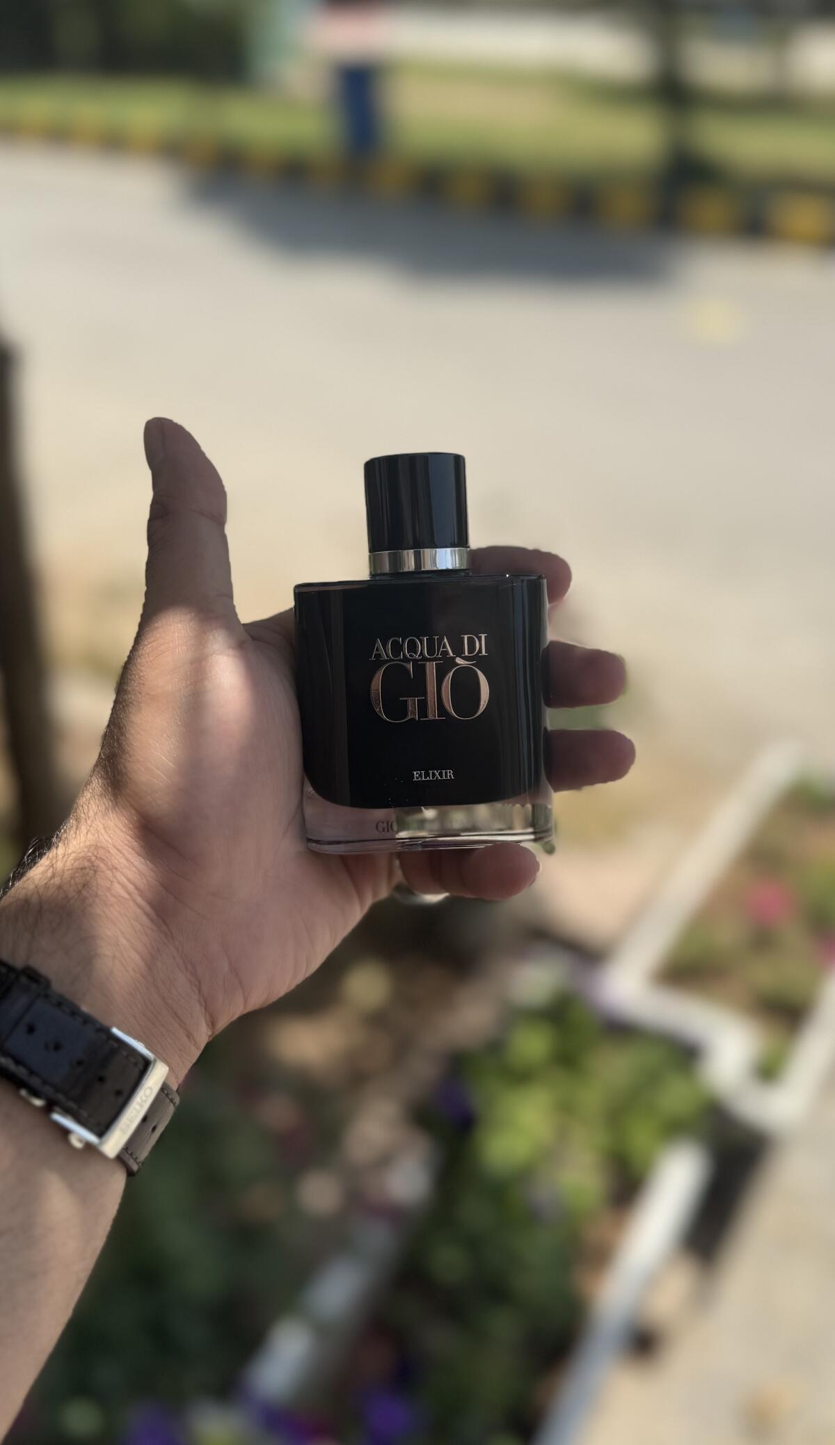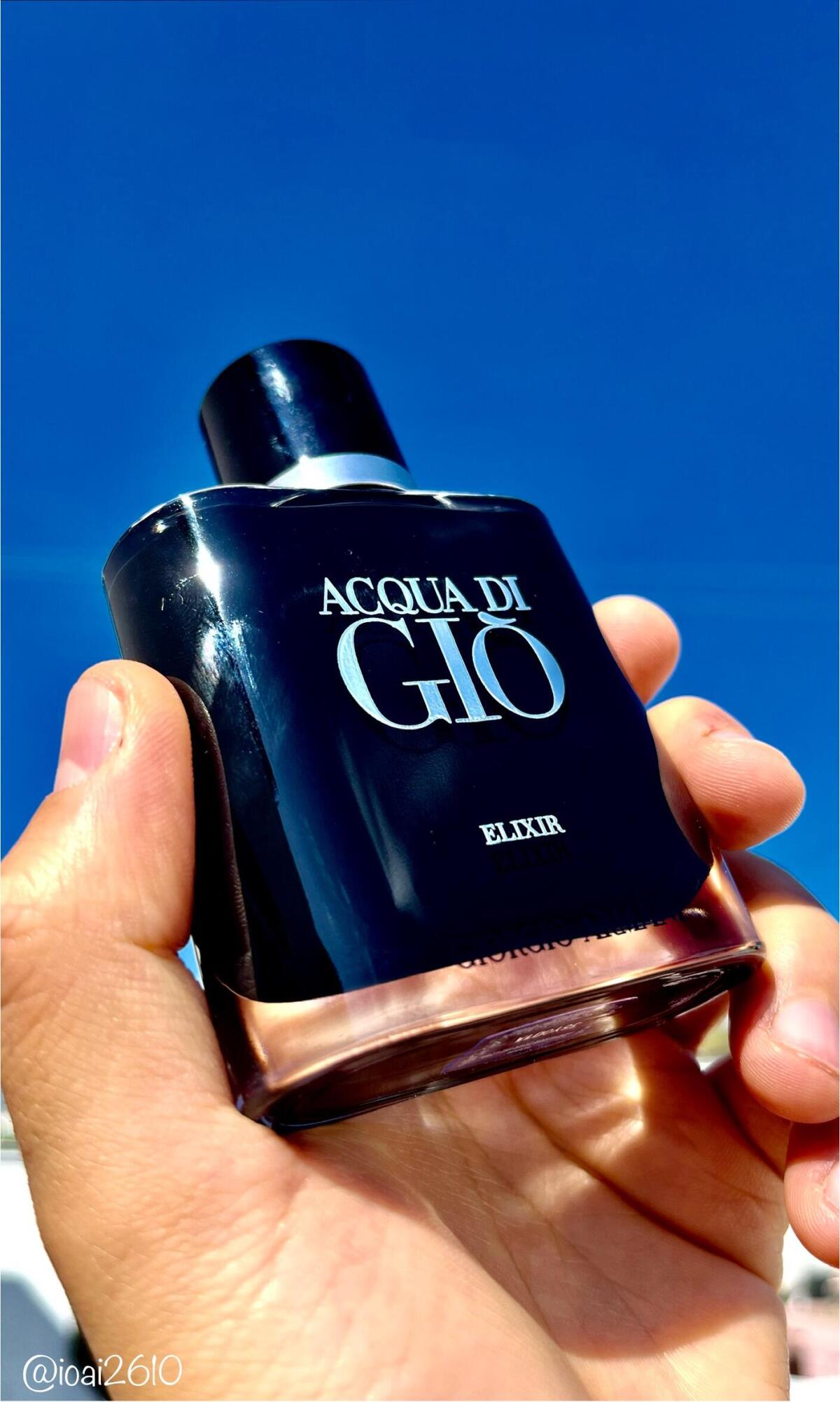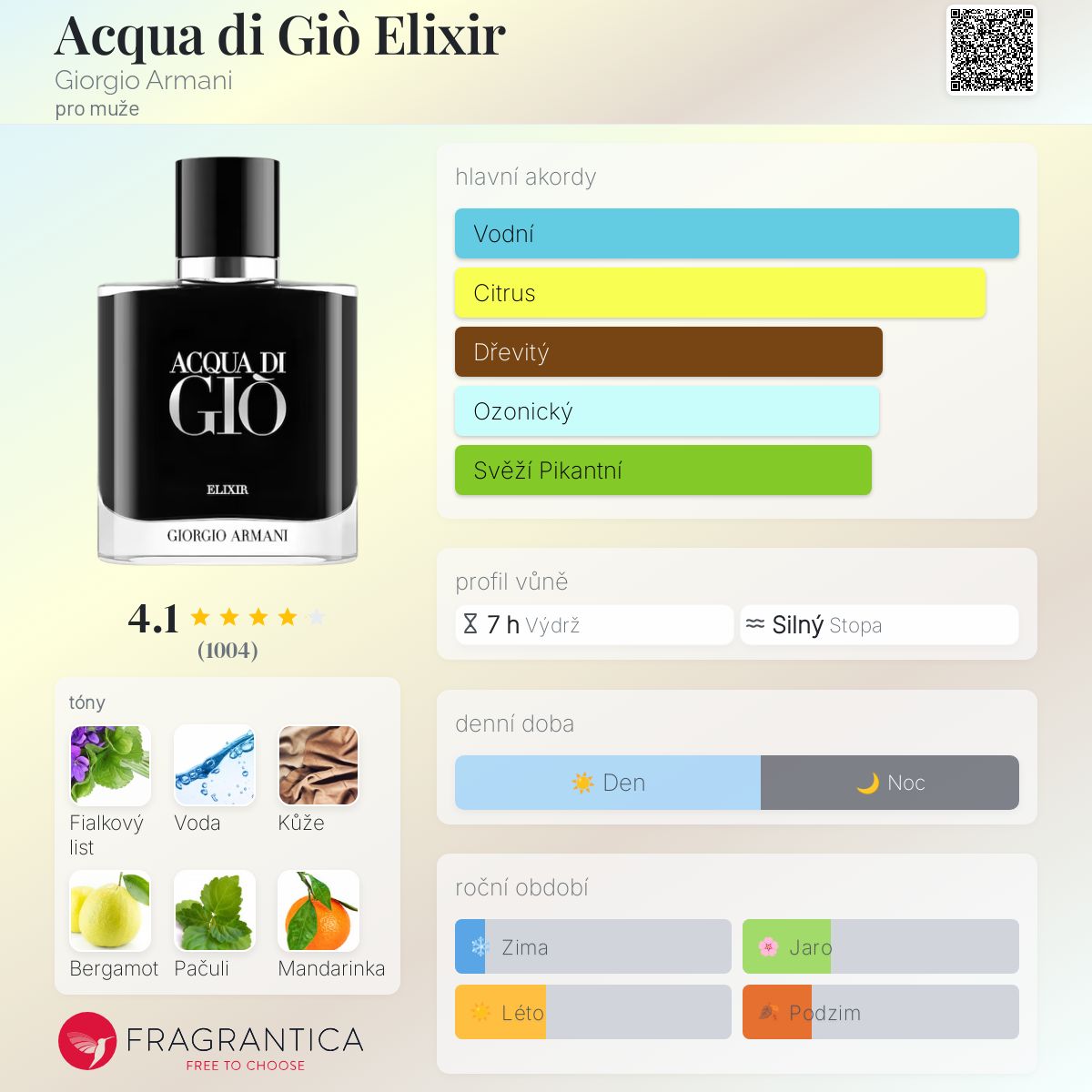 Acqua di Giò Elixir podle Giorgio Armani je Woody Aromatic vůně pro muže. Toto je nová vůně. Acqua di Giò Elixir byl/a uveden/a v roce 2025. "Nosem" za touto vůní je Alberto Morillas. Vrchní tóny jsou Bergamot, Zelená mandarinka a Muškátový oříšek; střední tóny jsouFialkový list a Vodní tóny ; základní tóny jsou Kůže, Pačuli, Vetiver a Labdanum.