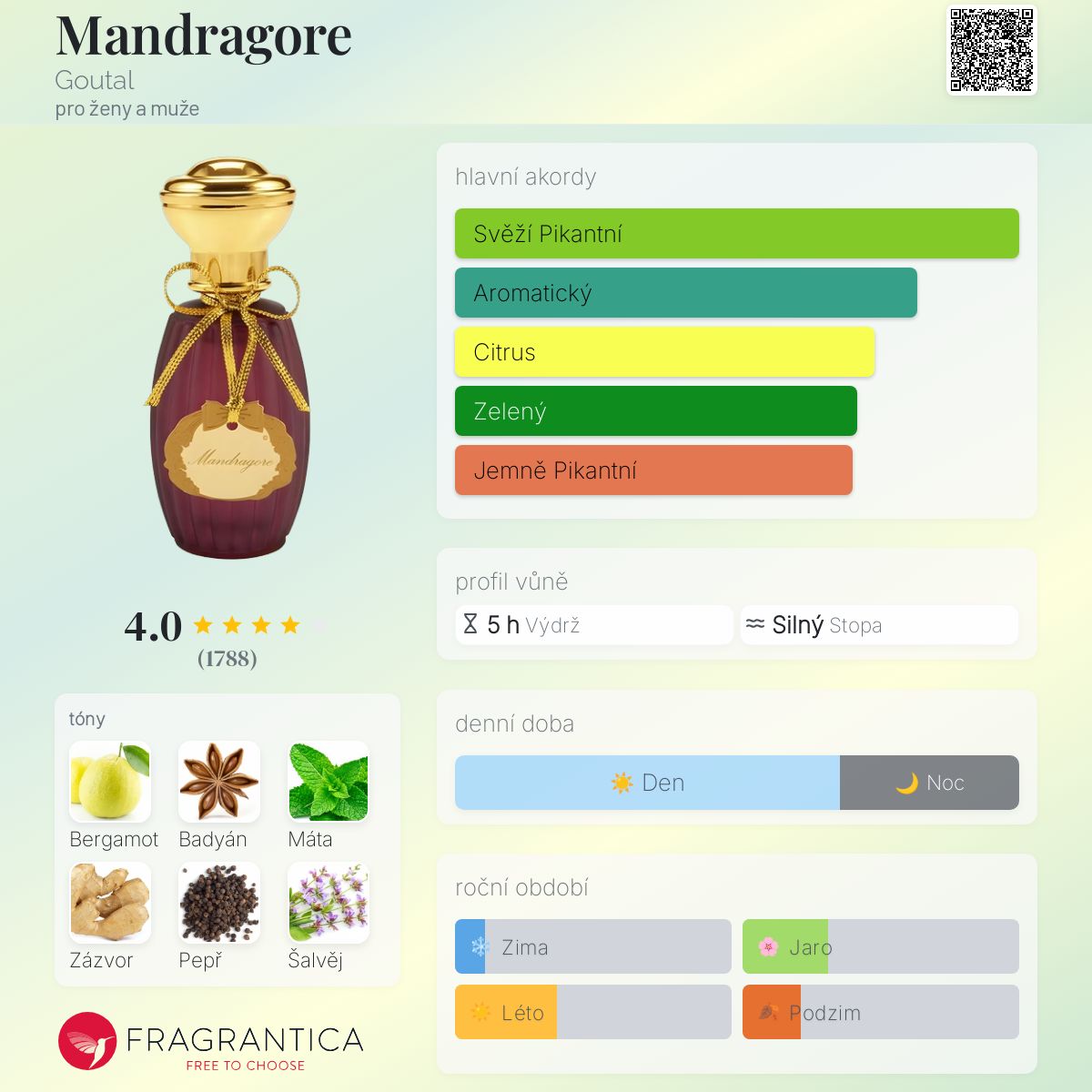 Mandragore podle Goutal je Woody Aromatic vůně pro ženy a muže. Mandragore byl/a uveden/a v roce 2009. "Nosem" za touto vůní je Isabelle Doyen. Vrchní tóny jsou Bergamot a Pepř; střední tóny jsouBadyán, Máta, Zázvor, Šalvěj a Kosatec ; základní tóny jsou Zimostráz a Labdanum.