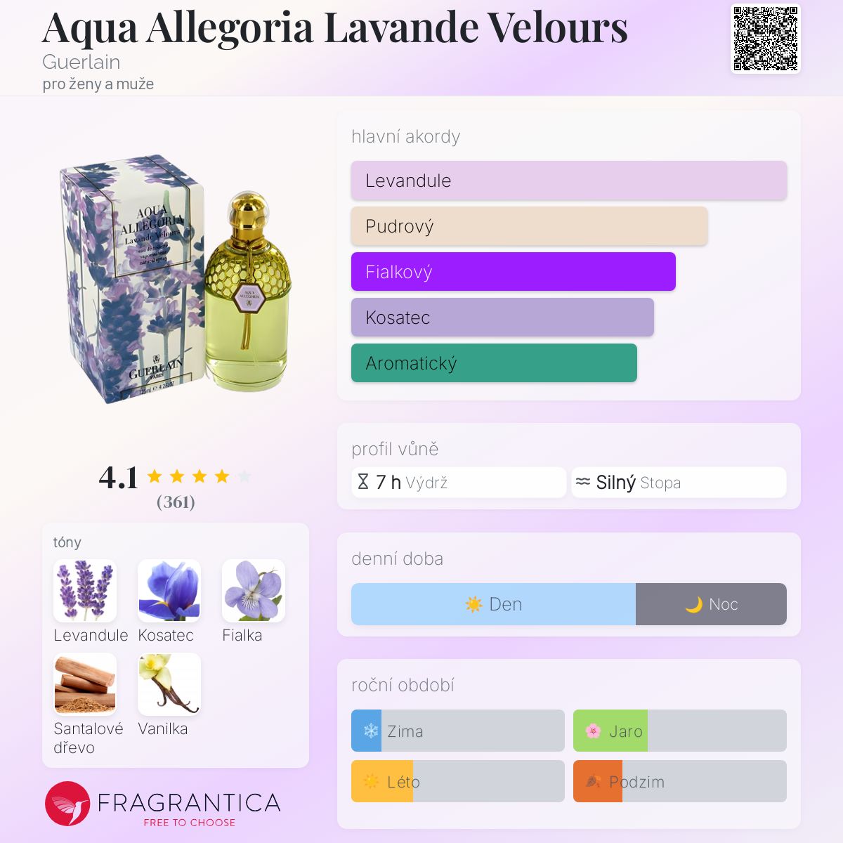Aqua Allegoria Lavande Velours podle Guerlain je Floral vůně pro ženy a muže. Aqua Allegoria Lavande Velours byl/a uveden/a v roce 1999. Aqua Allegoria Lavande Velours byl/a vytvořen/a Jean-Paul Guerlain a Mathilde Laurent. střední tóny jsouLevandule, Kosatec a Fialka ; základní tóny jsou Santalové dřevo a Vanilka.