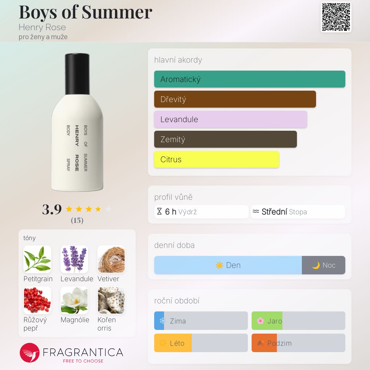 Boys of Summer podle Henry Rose je Aromatic Fougere vůně pro ženy a muže. Boys of Summer byl/a uveden/a v roce 2023. "Nosem" za touto vůní je Pascal Gaurin. Vrchní tóny jsou Petitgrain a Růžový pepř; střední tóny jsouLevandulový extrakt a Magnólie ; základní tóny jsou Haitský vetiver, Orris a Pačuli.
