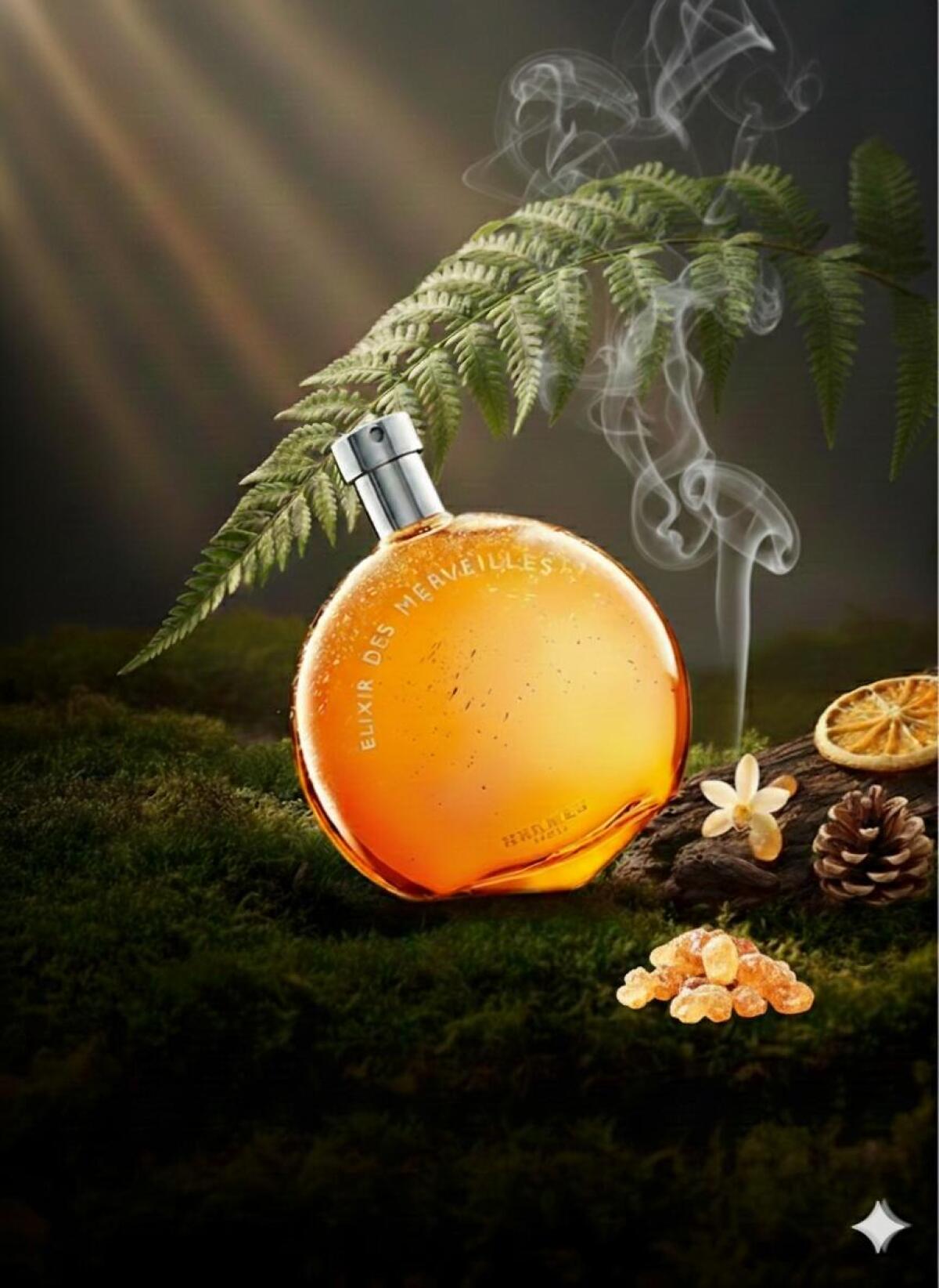 Elixir des Marveilles je ohromující vír kořeněného pomeranče, pryskyřice, balzámu a kadidla, naplněný krémovou karamelovou sladkostí a podmanivým živočišným jantarovým podtónem.