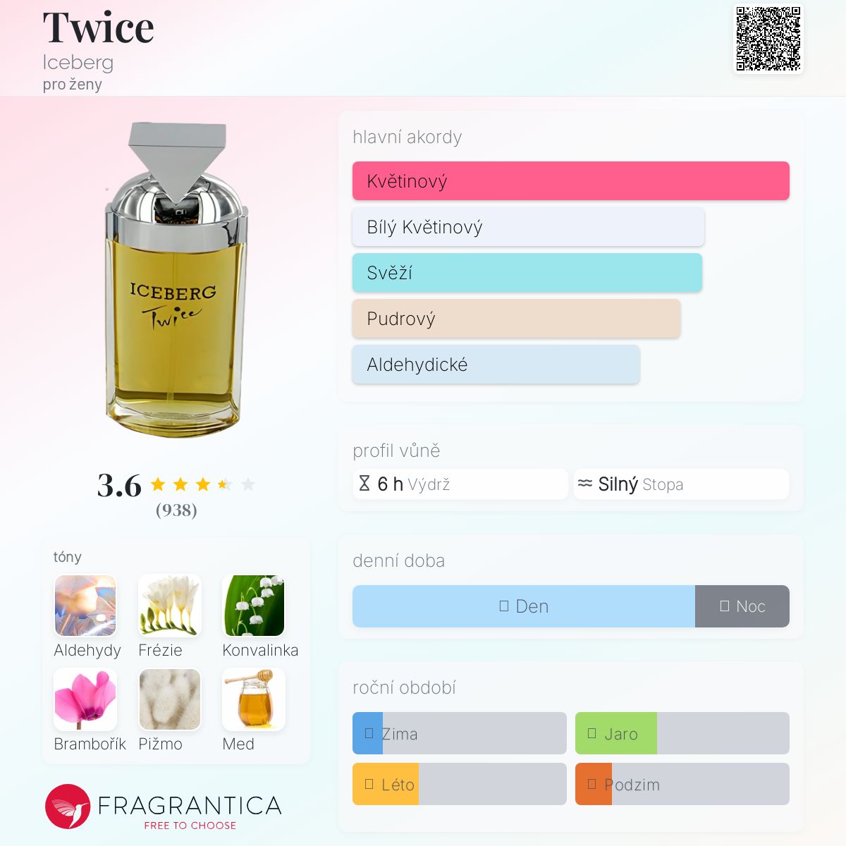 Twice podle Iceberg je Floral Aquatic vůně pro ženy. Twice byl/a uveden/a v roce 1995. Vrchní tóny jsou Aldehydy, Frézie, Konvalinka, Broskev a Bergamot; střední tóny jsouBrambořík, Gardénie, Fialka, Jasmín, Kořen orris, Růže a Orchidej ; základní tóny jsou Pižmo, Med, Santalové dřevo, Cedr a Jantar (ambra).