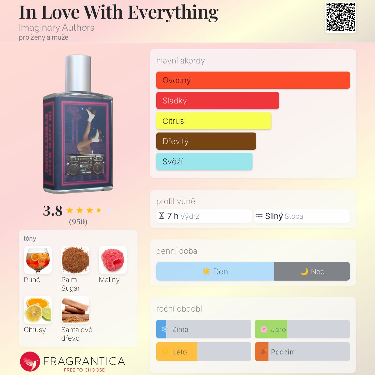Házení mé recenze do kruhu, protože jsem tvůrce obsahu a obdržel jsem to jako PR laskavost značky (děkuji IA). Tohle se vymyká tomu, co IA obvykle vytváří, a za to se mi to líbí! Je to super in your face tropický ovocný punč, ale oslnivým a trochu punkovým "je mi to jedno" způsobem. Seznam tónů zde na Fragrantice není úplný, podle IA je zde také marakuja, která je a stala se mou oblíbenou nótou, kdykoli se objeví v nějaké vůni! Naprosto miluji kreativitu této verze, která tak evokuje Miami 80. let. Celý den jsem poslouchala Tears for Fears a A Flock of Seagulls, když jsem skládala obsah tohoto výtvoru. TAK zábavné a velmi příjemné.