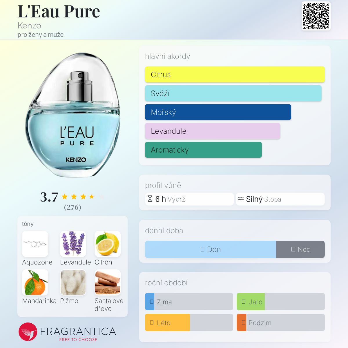 L'Eau Pure podle Kenzo je Citrus Aromatic vůně pro ženy a muže. Toto je nová vůně. L'Eau Pure byl/a uveden/a v roce 2025. "Nosem" za touto vůní je Daphné Bugey. Vrchní tóny jsou Citrón a Mandarinka; střední tóny jsouAquozone a Levandule ; základní tóny jsou Pižmo a Santalové dřevo.