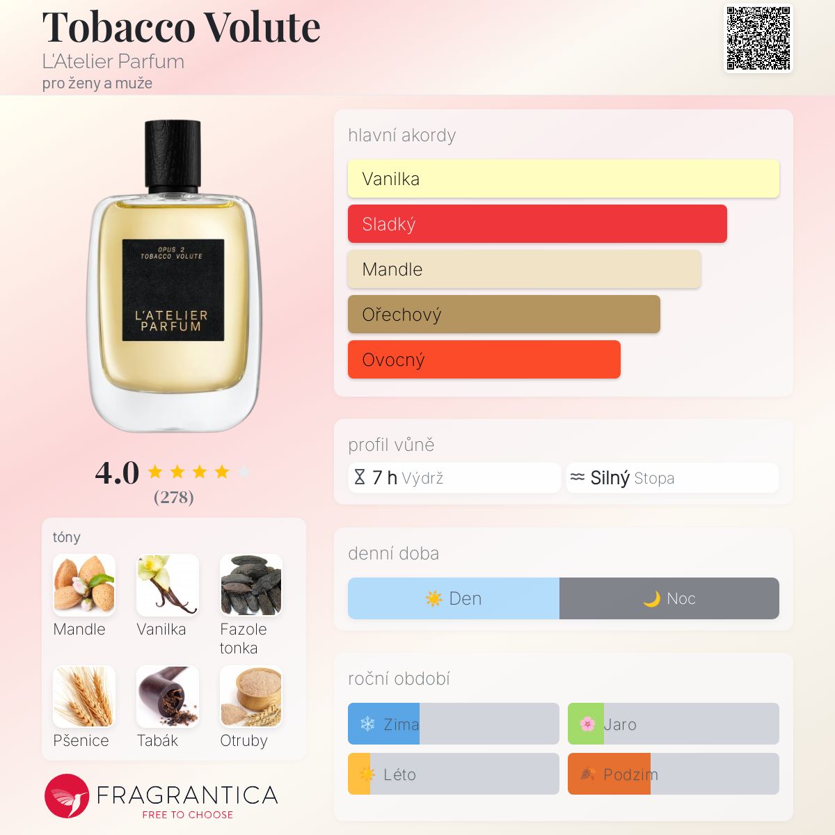 Tobacco Volute podle L'Atelier Parfum je vůně pro ženy a muže. Tobacco Volute byl/a uveden/a v roce 2022. "Nosem" za touto vůní je Alexis Dadier. Vrchní tóny jsou Hořká mandle, Pšenice a Otruby; střední tóny jsouTabák, Seno a Maté ; základní tóny jsou Bourbonská vanilka, Fazole tonka a Liatrix.