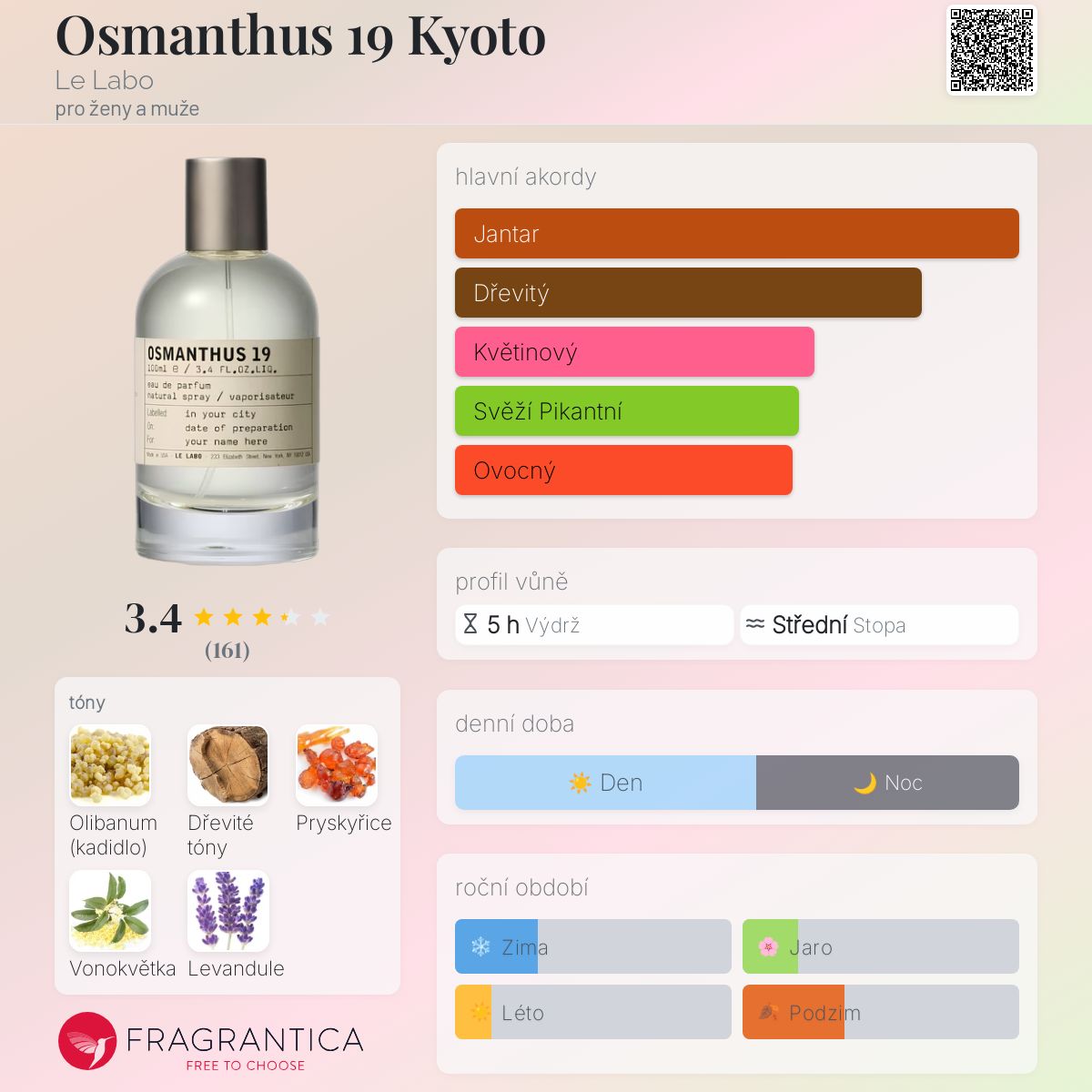 Osmanthus 19 Kyoto podle Le Labo je Orientální Floral vůně pro ženy a muže. Toto je nová vůně. Osmanthus 19 Kyoto byl/a uveden/a v roce 2024. Vrchní tóny jsou Kadidlo a Levandule; střední tón jeVonokvětka ; základní tóny jsou Dřevité tóny a Pryskyřice.