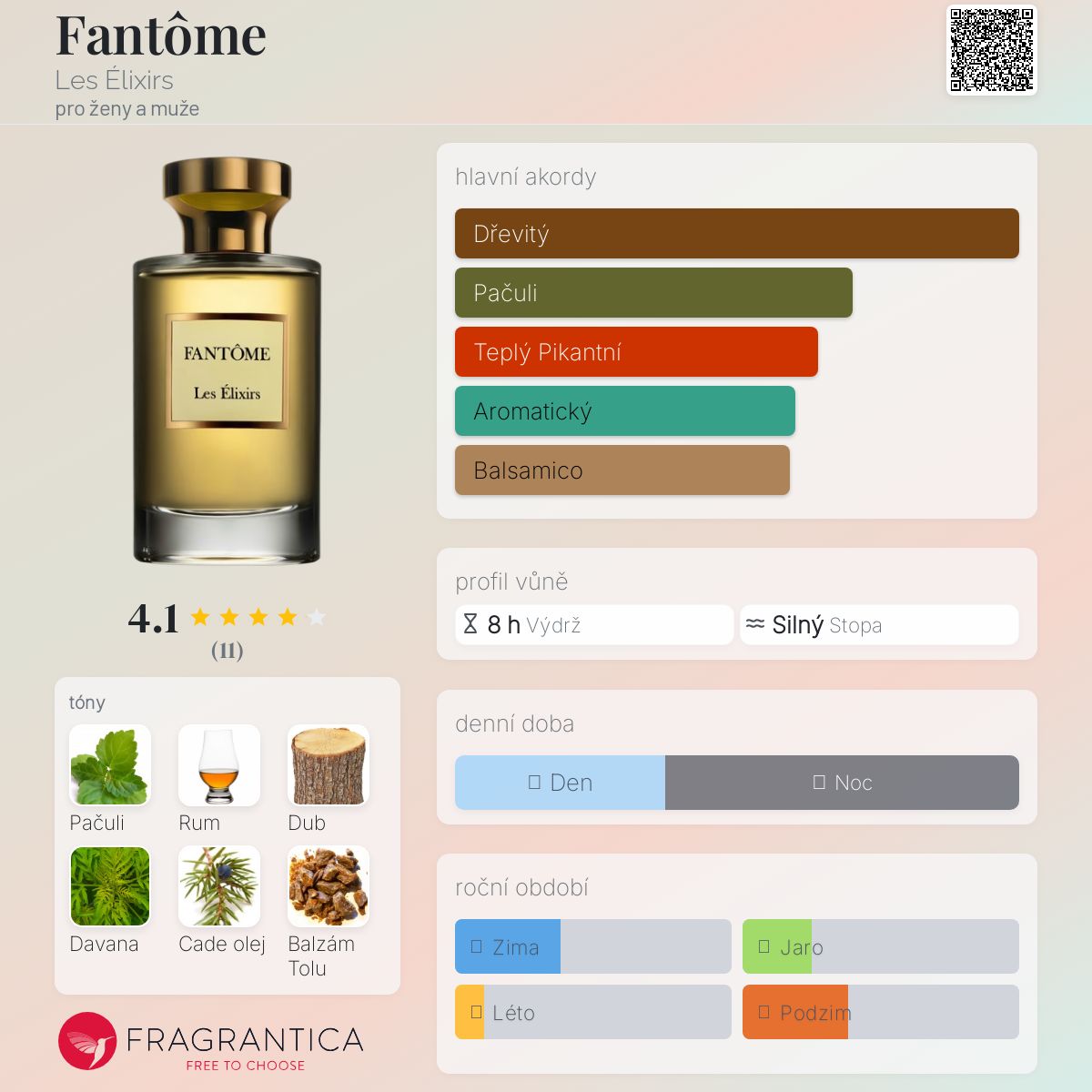 Fantôme podle Les Élixirs je Orientální Woody vůně pro ženy a muže. Toto je nová vůně. Fantôme byl/a uveden/a v roce 2023. "Nosem" za touto vůní je Rodrigo Flores-Roux. Vrchní tóny jsou Rum, Dub a Bergamot; střední tóny jsouDavana, Cade olej a Růžová voda ; základní tóny jsou Pačuli, Balzám Tolu, Papyrus a Vanilka.