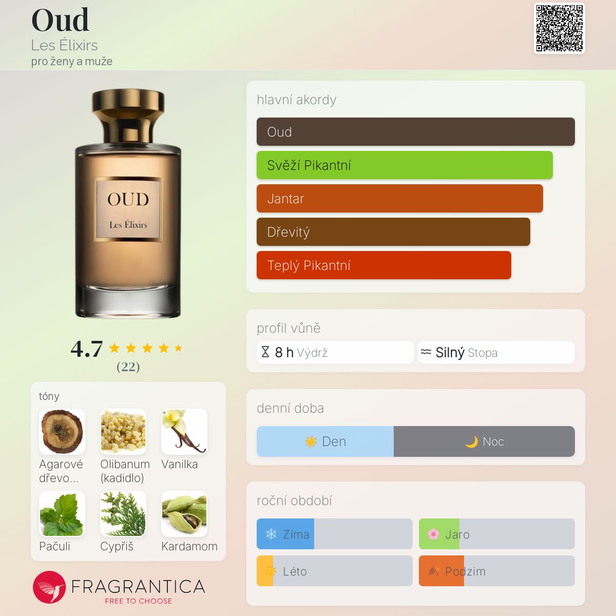 Oud podle Les Élixirs je Woody Spicy vůně pro ženy a muže. Oud byl/a uveden/a v roce 2020. "Nosem" za touto vůní je Rodrigo Flores-Roux. Vrchní tóny jsou Cypřiš a Krvavý pomeranč; střední tóny jsouKadidlo, Kardamom a Timur ; základní tóny jsou Agarové dřevo (oud), Vanilka a Pačuli.