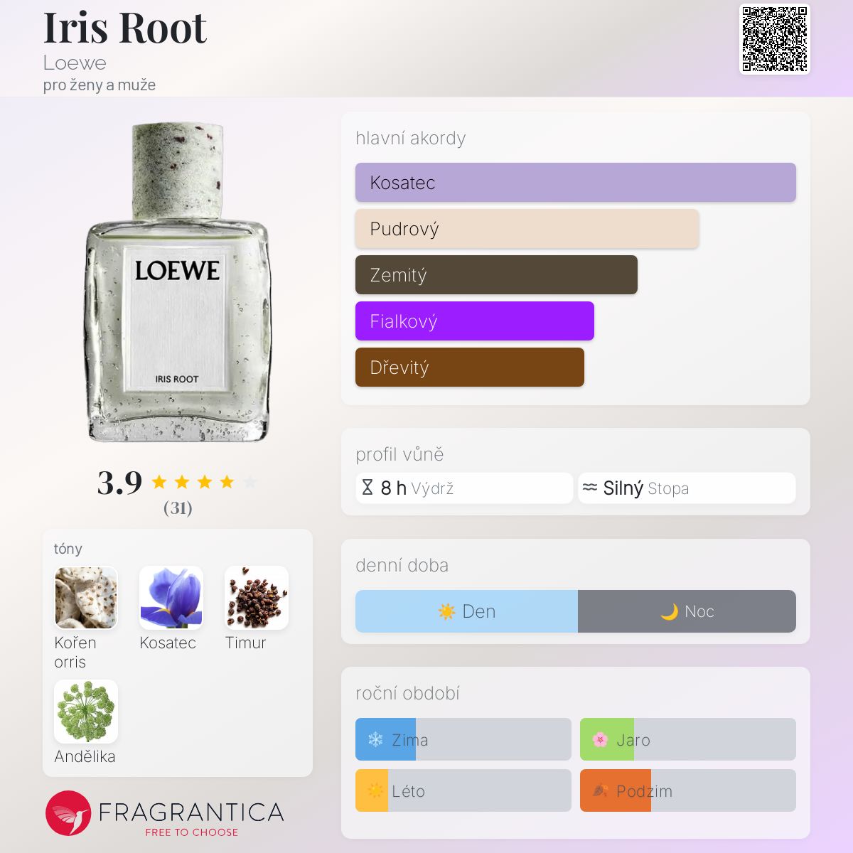 Iris Root podle Loewe je Floral Woody Musk vůně pro ženy a muže. Toto je nová vůně. Iris Root byl/a uveden/a v roce 2025. "Nosem" za touto vůní je Nuria Cruelles. Vrchní tóny jsou Timur a Andělika; střední tóny jsouKořen kosatce a Kosatec ;
