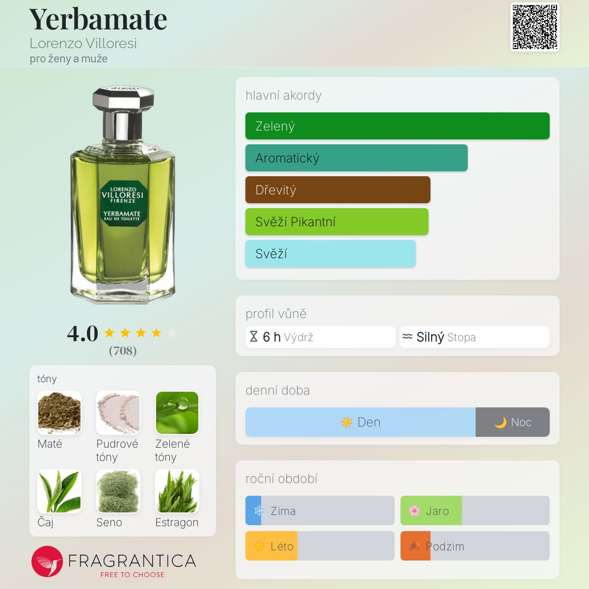 Yerbamate podle Lorenzo Villoresi je Aromatic Green vůně pro ženy a muže. Yerbamate byl/a uveden/a v roce 2001. "Nosem" za touto vůní je Lorenzo Villoresi. Vrchní tóny jsou Maté, Zelené tóny, Čaj, Estragon, Tráva, Máta, Ylang-Ylang, Brazilské růžové dřevo a Citrusy; střední tóny jsouMaté, Zelené tóny, Čaj, Seno, Tráva a Levandule ; základní tóny jsou Pudrové tóny, Zelené tóny, Čaj, Galbanum, Vetiver, Dubový mech, Koření, Dřevité tóny, Francouzské labdanum a Pačuli.