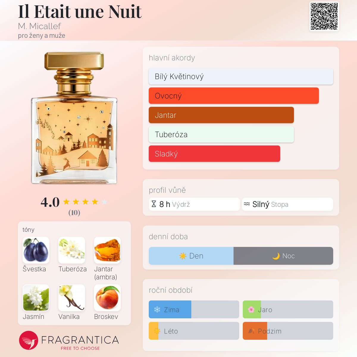 Il Etait une Nuit podle M. Micallef je Floral Fruity vůně pro ženy a muže. Toto je nová vůně. Il Etait une Nuit byl/a uveden/a v roce 2024. "Nosem" za touto vůní je Martine Micallef. Vrchní tóny jsou Švestka a Broskev; střední tóny jsouTuberóza, Jasmín a Vanilka ; základní tóny jsou Jantar (ambra), Vanilka a Bílé pižmo.