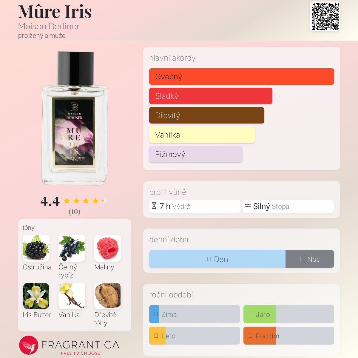 Mûre Iris podle Maison Berliner je Floral Fruity Gourmand vůně pro ženy a muže. Toto je nová vůně. Mûre Iris byl/a uveden/a v roce 2025. "Nosem" za touto vůní je Jean-Michel Duriez. Vrchní tóny jsou Ostružina, Černý rybíz a Maliny; střední tón jeKosatcové máslo ; základní tóny jsou Vanilka, Dřevité tóny, Pižmo a Benzoin.
