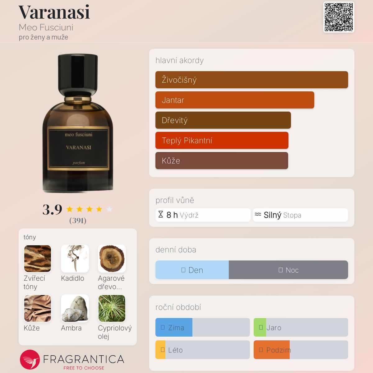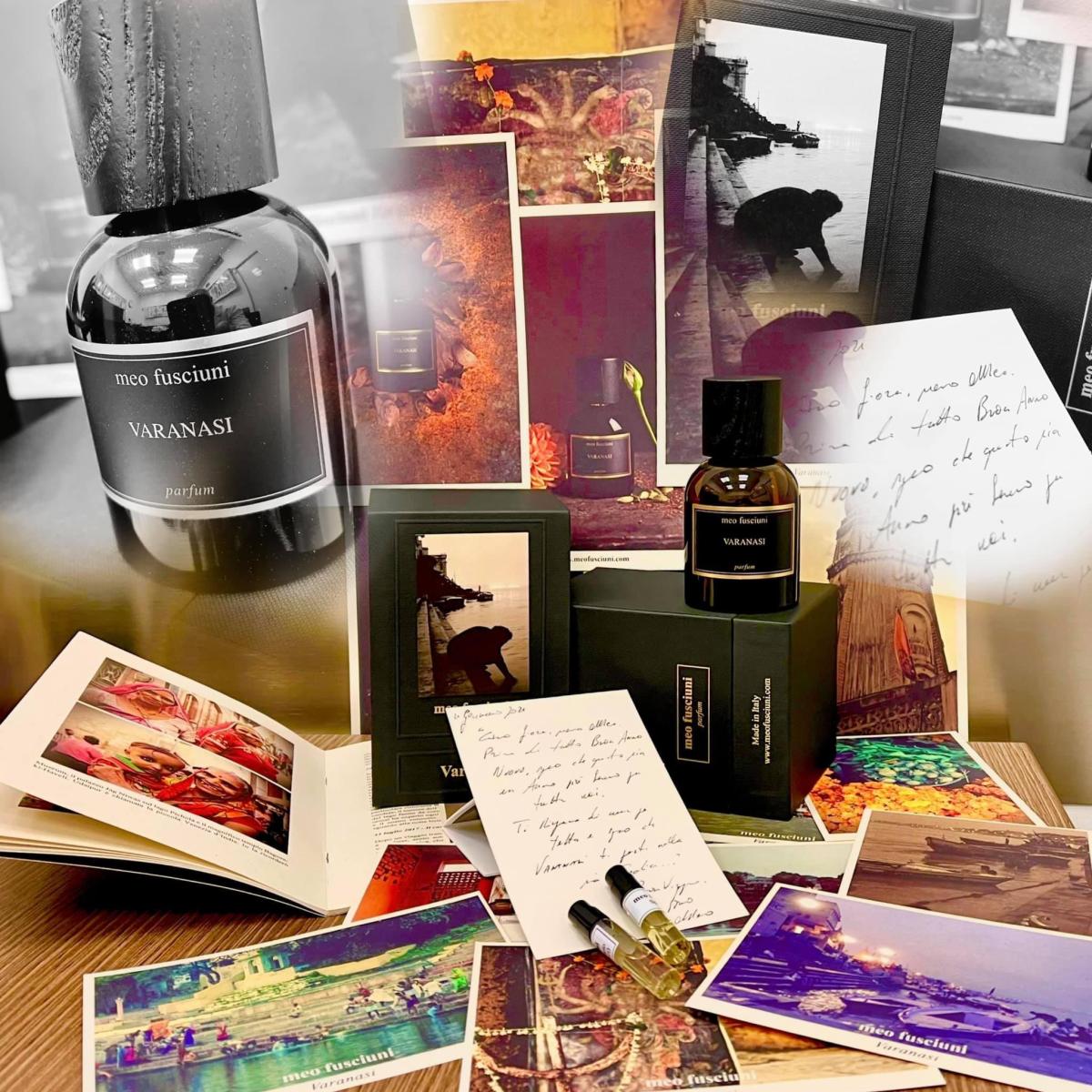 Varanasi podle Meo Fusciuni je Orientální Spicy vůně pro ženy a muže. Varanasi byl/a uveden/a v roce 2020. "Nosem" za touto vůní je Giuseppe Imprezzabile. Vrchní tóny jsou Kadidlo, Šafrán, Muškátový oříšek a Kardamom; střední tóny jsouAmbra, Cypriolový olej, Růže, Ambrette (přírodní pižmo) a Jasmín ; základní tóny jsou Zvířecí tóny, Agarové dřevo (oud), Kůže, Nard himálajský, Gurjanský balzám a Vetiver.