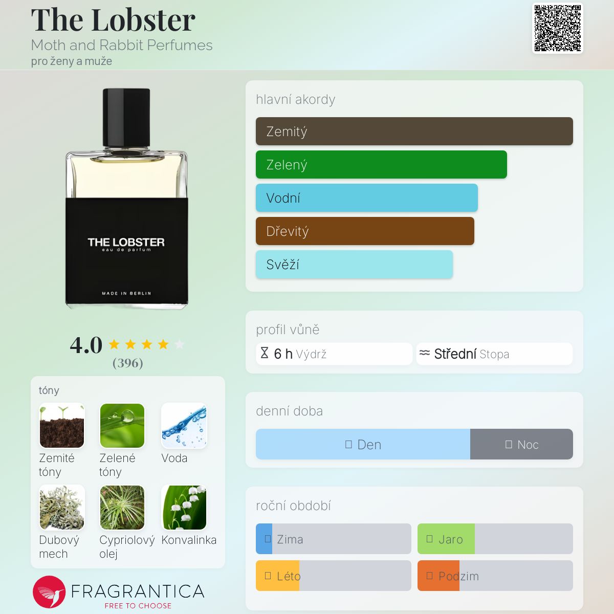 The Lobster podle Moth and Rabbit Perfumes je vůně pro ženy a muže. "Nosem" za touto vůní je Mark Buxton. Vrchní tóny jsou Zelené tóny, Cypriolový olej a Konvalinka; střední tóny jsouZelené listí, Vodní tóny a Cedr ; základní tóny jsou Zemité tóny, Mech, Myrha, Prha, Pískavice řecké seno a Zvířecí tóny.