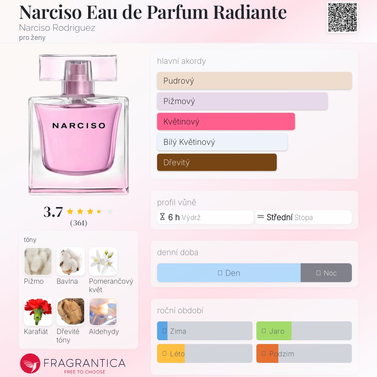 Narciso Eau de Parfum Radiante podle Narciso Rodriguez je Floral Woody Musk vůně pro ženy. Toto je nová vůně. Narciso Eau de Parfum Radiante byl/a uveden/a v roce 2025. Vrchní tóny jsou Karafiát, Aldehydy a Konvalinka; střední tóny jsouBavlna, Pomerančový květ a Hřebíček ; základní tóny jsou Pižmo, Dřevité tóny, Vetiver, Virginský cedr a Jantar (ambra).