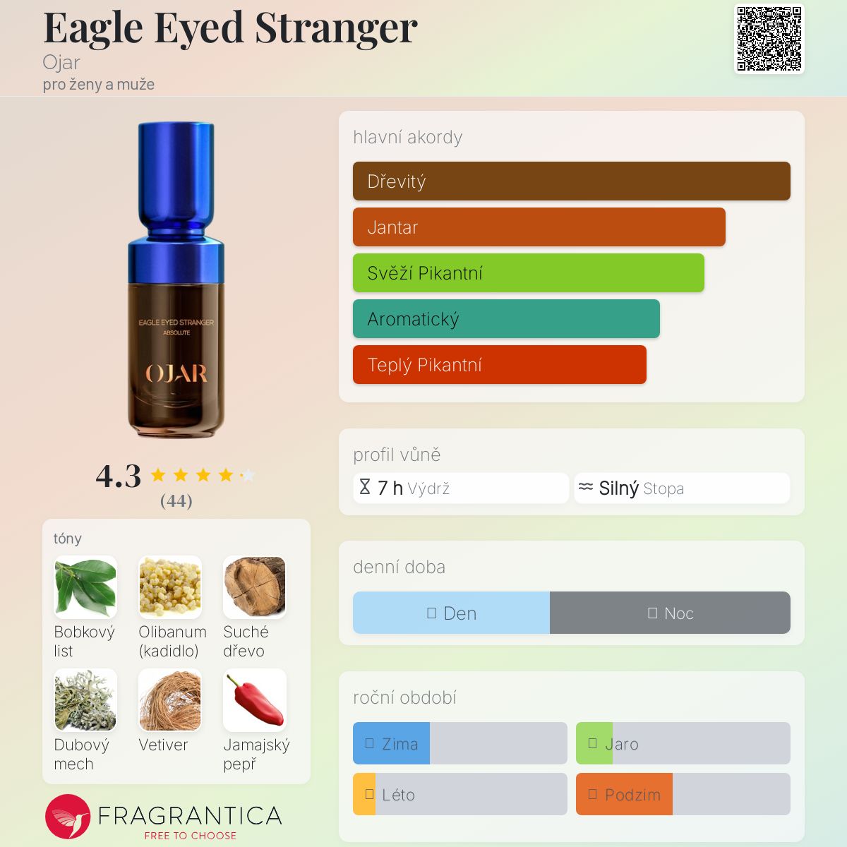 Eagle Eyed Stranger podle Ojar je Woody vůně pro ženy a muže. Eagle Eyed Stranger byl/a uveden/a v roce 2021. "Nosem" za touto vůní je Jordi Fernández. Vrchní tóny jsou Bobkový list, Kadidlo a Konvalinka; střední tóny jsouSuché dřevo, Dubový mech a Vetiver ; základní tóny jsou Jamajský pepř, Bílý jantar (ambra) a Bříza.