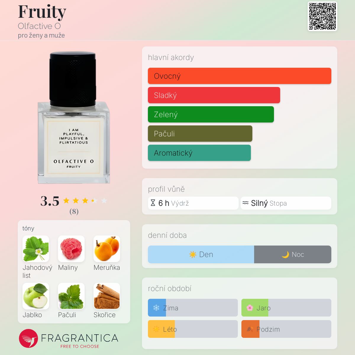 Fruity podle Olfactive O je Floral Fruity vůně pro ženy a muže. Fruity byl/a uveden/a v roce 2019. "Nosem" za touto vůní je Olivia da Costa. Vrchní tóny jsou Jahodový list a Maliny; střední tóny jsouMeruňka, Jablko, Skořice a Citrón ; základní tóny jsou Pačuli, Pustoryl a Pižmo.