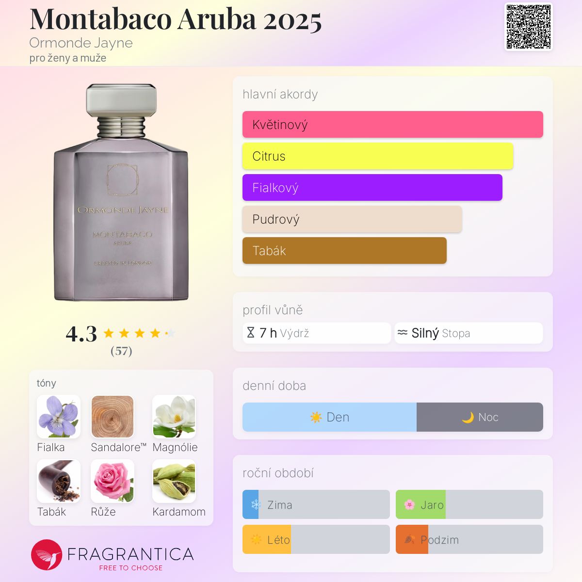 Montabaco Aruba 2025 podle Ormonde Jayne je Citrus Aromatic vůně pro ženy a muže. Toto je nová vůně. Montabaco Aruba 2025 byl/a uveden/a v roce 2025. Vrchní tóny jsou Grapefruit, Pomeranč a Bergamot; střední tóny jsouFialka, Magnólie, Růže a Jasmín ; základní tóny jsou Sandalore™, Tabákový list, Kardamom a Kůže.