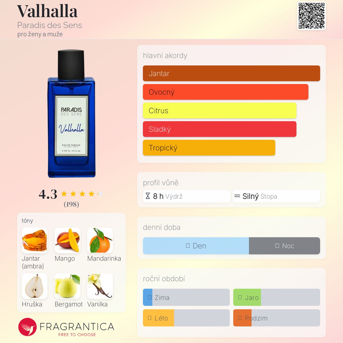 Valhalla podle Paradis des Sens je Floral Fruity vůně pro ženy a muže. Valhalla byl/a uveden/a v roce 2023. "Nosem" za touto vůní je Pierre-Constantin Guéros. Vrchní tóny jsou Mango, Mandarinka, Hruška a Bergamot; střední tóny jsouCedr, Kašmírové dřevo a Egyptský jasmín ; základní tóny jsou Jantar (ambra), Vanilka, Fazole tonka, Ambrostar™ a Jantarové dřevo.