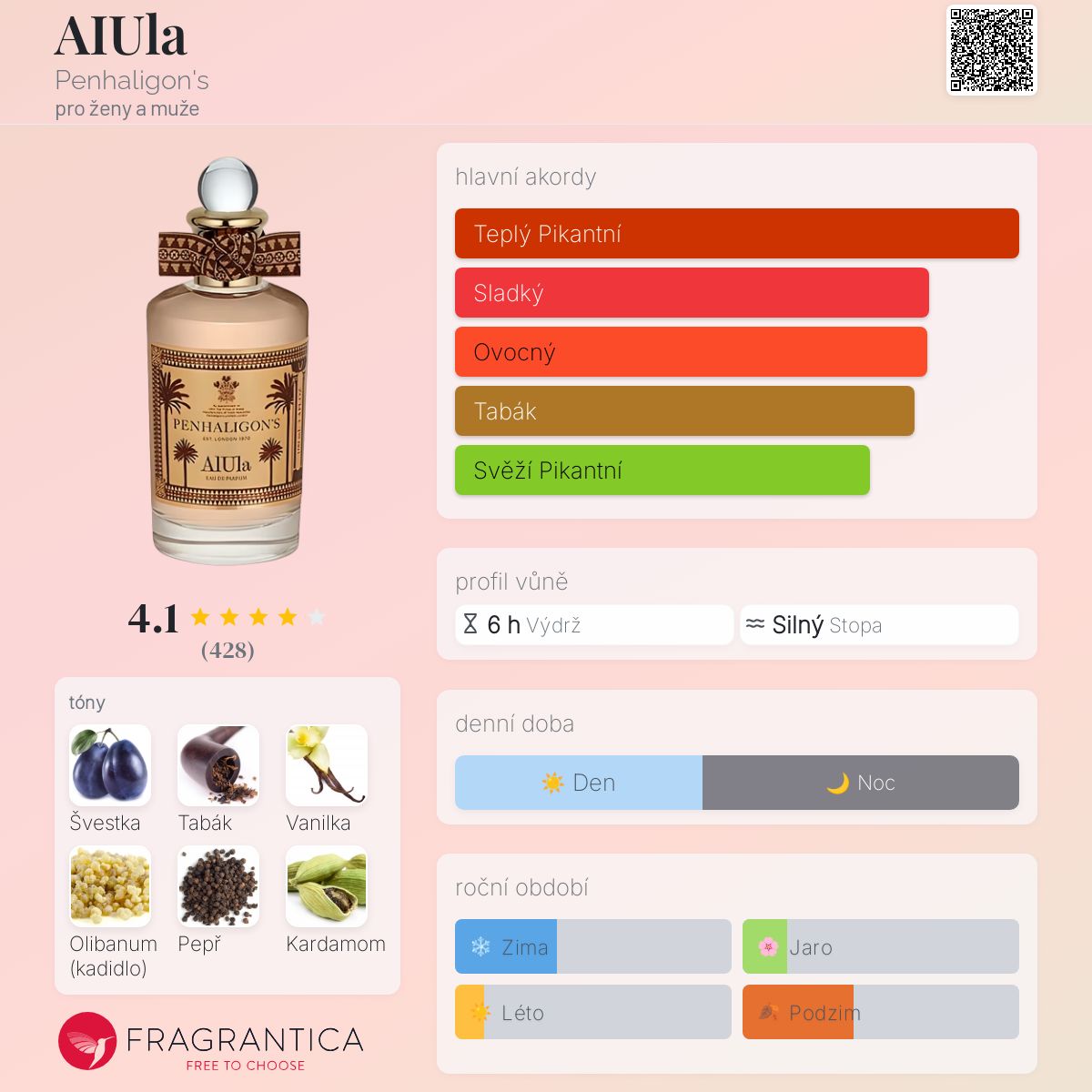 AIUla podle Penhaligon's je vůně pro ženy a muže. Toto je nová vůně. AIUla byl/a uveden/a v roce 2024. Vrchní tóny jsou Kadidlo, Černý pepř a Guatemalský kardamom; střední tóny jsouŠvestka, Tabák a Šafrán ; základní tóny jsou Vanilka a Kurkuma.