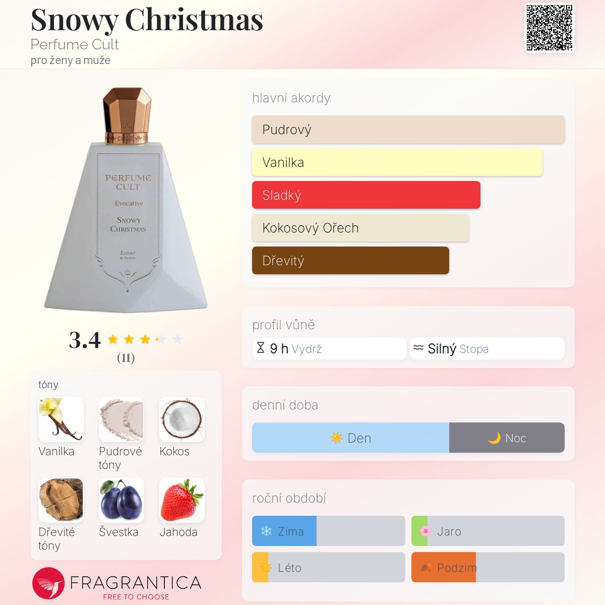 Snowy Christmas podle Perfume Cult je Floral Fruity Gourmand vůně pro ženy a muže. Snowy Christmas byl/a uveden/a v roce 2023. "Nosem" za touto vůní je Christelle Laprade. Vrchní tóny jsou Kokos, Švestka, Jahoda, Bergamot a Meruňka; střední tóny jsouYlang-Ylang, Levandule, Jasmín, Šeřík, Konvalinka a Palisandr ; základní tóny jsou Vanilka, Pudrové tóny, Dřevité tóny a Jantar (ambra).