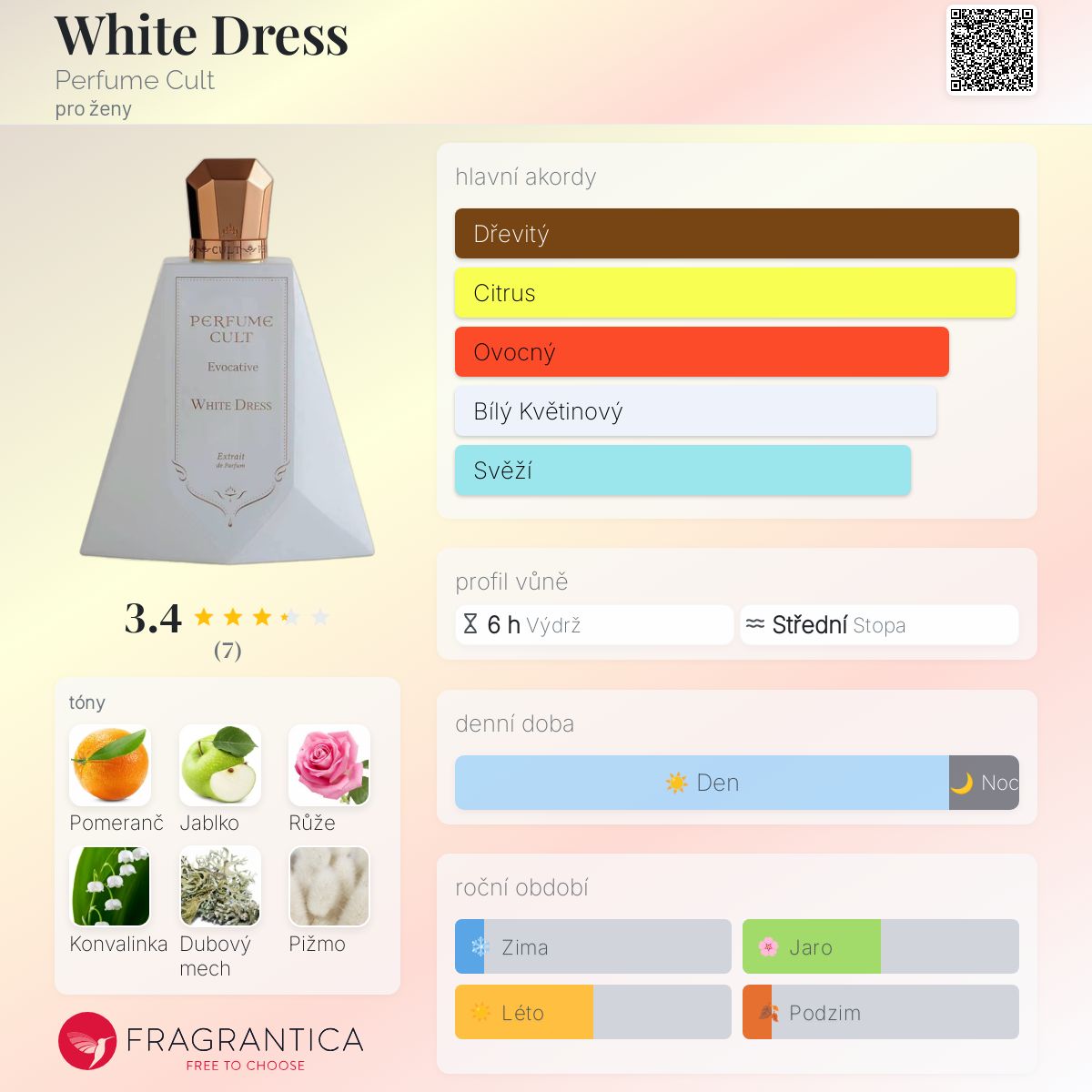 White Dress podle Perfume Cult je Floral Fruity vůně pro ženy. White Dress byl/a uveden/a v roce 2023. "Nosem" za touto vůní je Philippe Paparella-Paris. Vrchní tóny jsou Pomeranč, Jablko, Růžový pepř, Mandarinka, Citrón, Švestka a Meruňka; střední tóny jsouRůže, Konvalinka, Jasmín a Palisandr ; základní tóny jsou Mech, Pižmo, Santalové dřevo, Cedr, Pačuli a Jantar (ambra).