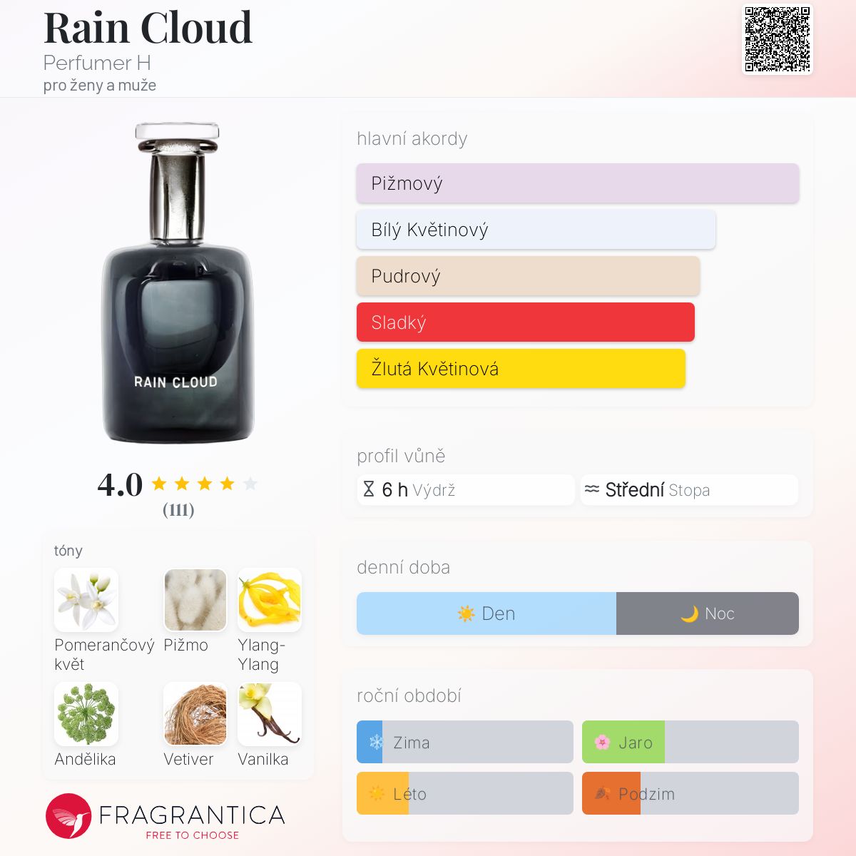 Rain Cloud podle Perfumer H je Aromatic Aquatic vůně pro ženy a muže. Rain Cloud byl/a uveden/a v roce 2016. "Nosem" za touto vůní je Lyn Harris. Vrchní tóny jsou Pomerančový květ a Andělika; střední tón jeYlang-Ylang ; základní tóny jsou Pižmo, Vetiver a Bourbonská vanilka.