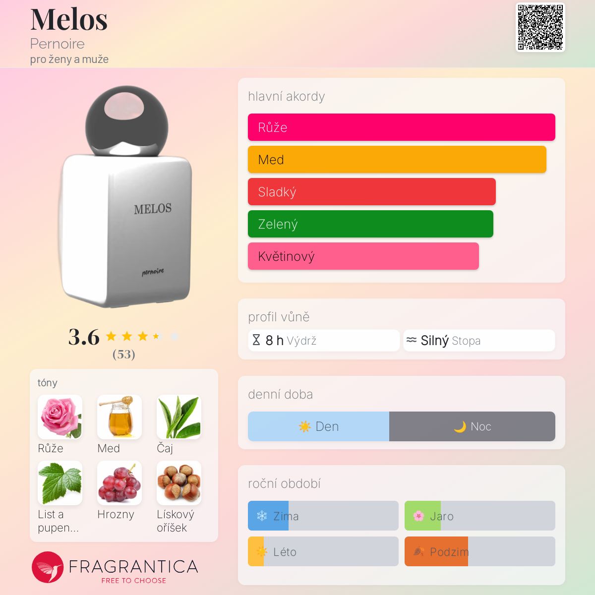 Melos podle Pernoire je vůně pro ženy a muže. Toto je nová vůně. Melos byl/a uveden/a v roce 2025. Vrchní tóny jsou Čajová růže, Čaj, Černý rybíz, Hrozny a Grapefruit; střední tóny jsouRůže, Med, Lískový oříšek, Pečené jablko a Šafrán ; základní tóny jsou Jantar (ambra), Pižmo, Pačuli a Mléko.