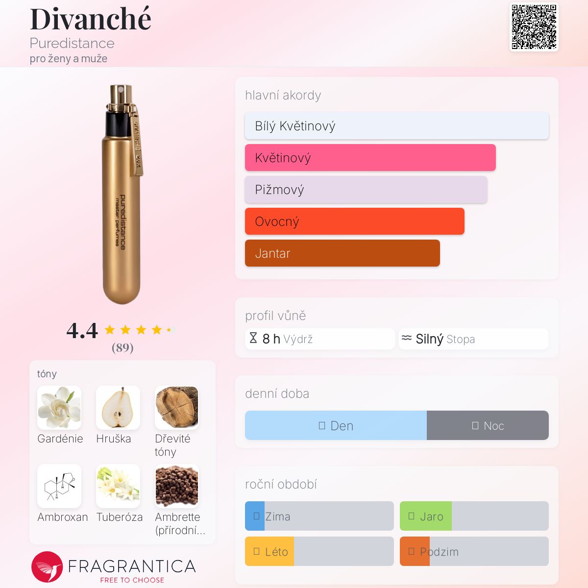 Divanché podle Puredistance je Floral Fruity vůně pro ženy a muže. Toto je nová vůně. Divanché byl/a uveden/a v roce 2025. "Nosem" za touto vůní je Nathalie Feisthauer. Vrchní tóny jsou Hruška, Jablko a Ananas; střední tóny jsouGardénie, Indická tuberóza, Magnólie champaca, Indický jasmín, Otočník a Hedione ; základní tóny jsou Dřevité tóny, Ambroxan, Ambrette (přírodní pižmo), Muscone, Benzoin a Siam.