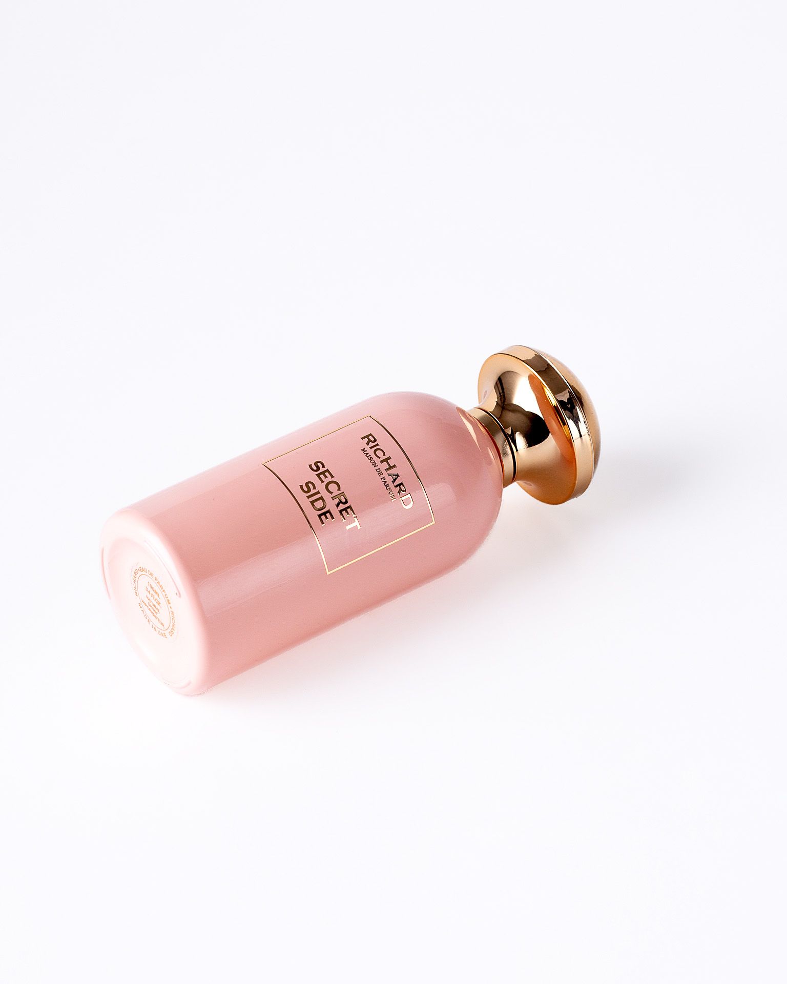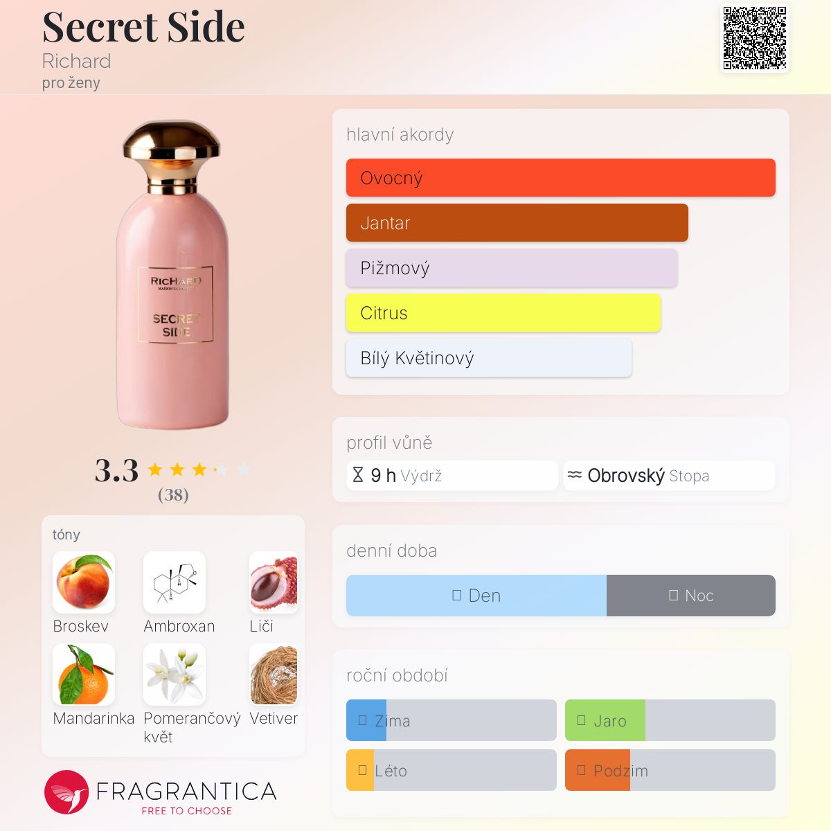 Secret Side podle Richard je Floral Fruity vůně pro ženy. Secret Side byl/a uveden/a v roce 2023. Vrchní tóny jsou Liči, Mandarinka a Pomerančový květ; střední tóny jsouBroskev, Vetiver a Konvalinka ; základní tóny jsou Ambroxan, Pižmo a Vanilka.