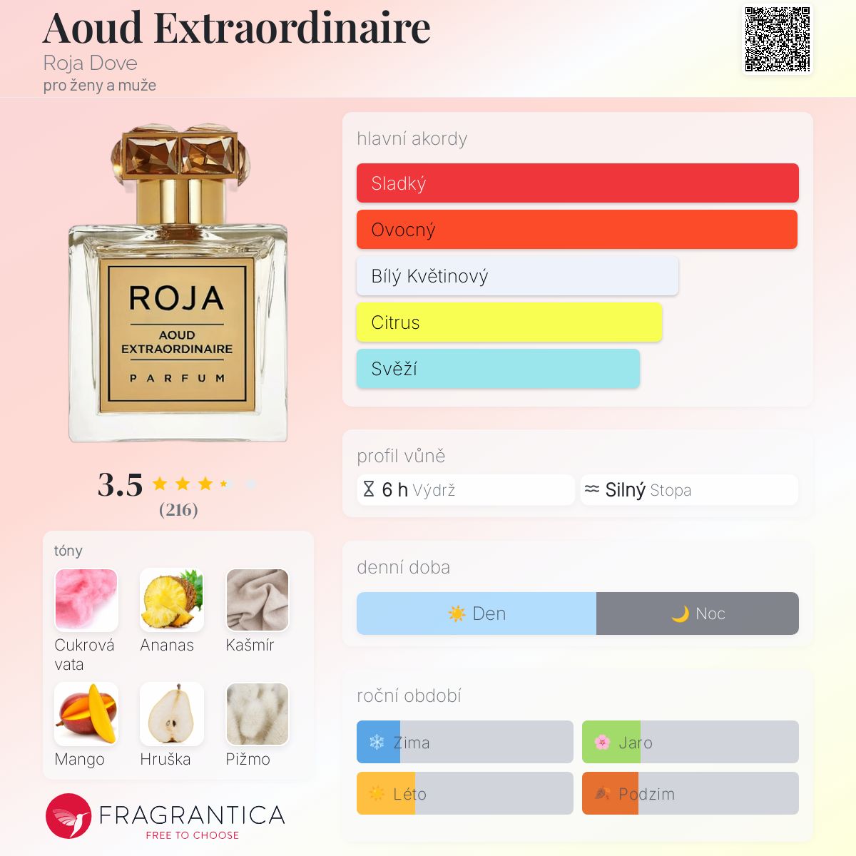 Aoud Extraordinaire podle Roja Dove je Orientální Woody vůně pro ženy a muže. Toto je nová vůně. Aoud Extraordinaire byl/a uveden/a v roce 2024. Vrchní tóny jsou Ananas, Mango, Hruška, Jablko, Švestka, Jasmín, Grapefruit, Mandarinka, Bergamot a Broskev; střední tóny jsouPomerančový květ, Konvalinka, Jasmín, Pelargónie, Brambořík, Otočník a Růže ; základní tóny jsou Cukrová vata, Kašmír, Pižmo, Jantar (ambra), Dřevité tóny, Karamela, Vetiver, Vanilka, Kůže a Agarové dřevo (oud).