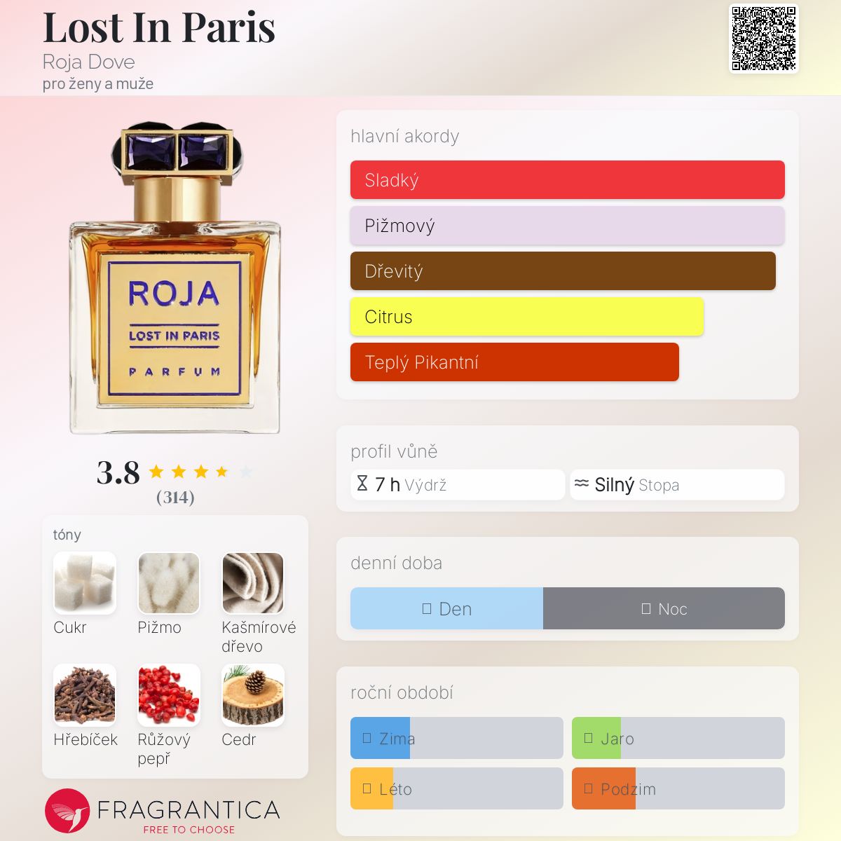 Lost In Paris podle Roja Dove je Orientální Vanilla vůně pro ženy a muže. Toto je nová vůně. Lost In Paris byl/a uveden/a v roce 2024. Vrchní tóny jsou Mandarinka, Rum, Krvavý pomeranč a Hořký pomeranč; střední tóny jsouCukr, Máslo a Karamel ; základní tóny jsou Pižmo, Kašmírové dřevo, Hřebíček, Růžový pepř, Cedr, Vanilka, Skořice a Ambra.