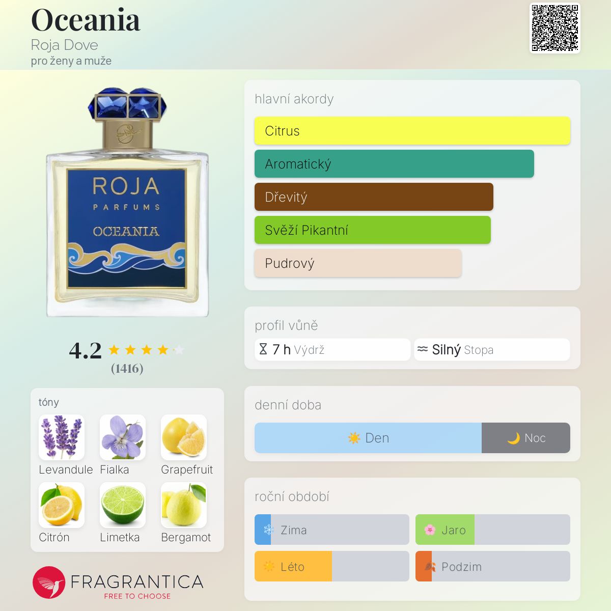 Oceania podle Roja Dove je Woody Aromatic vůně pro ženy a muže. Oceania byl/a uveden/a v roce 2019. "Nosem" za touto vůní je Roja Dove. Vrchní tóny jsou Levandule, Grapefruit, Citrón, Limetka, Bergamot, Mandarinka, Rozmarýn, Tymián a Dvakratec; střední tóny jsouFialka, Jasmín, Jasmín Sambac, Pelargónie a Ylang-Ylang ; základní tóny jsou Kosatec, Pižmo, Cedr, Mech, Jalovcové bobulky, Vetiver, Santalové dřevo, Galbanum, Benzoin, Labdanum a Vanilka.