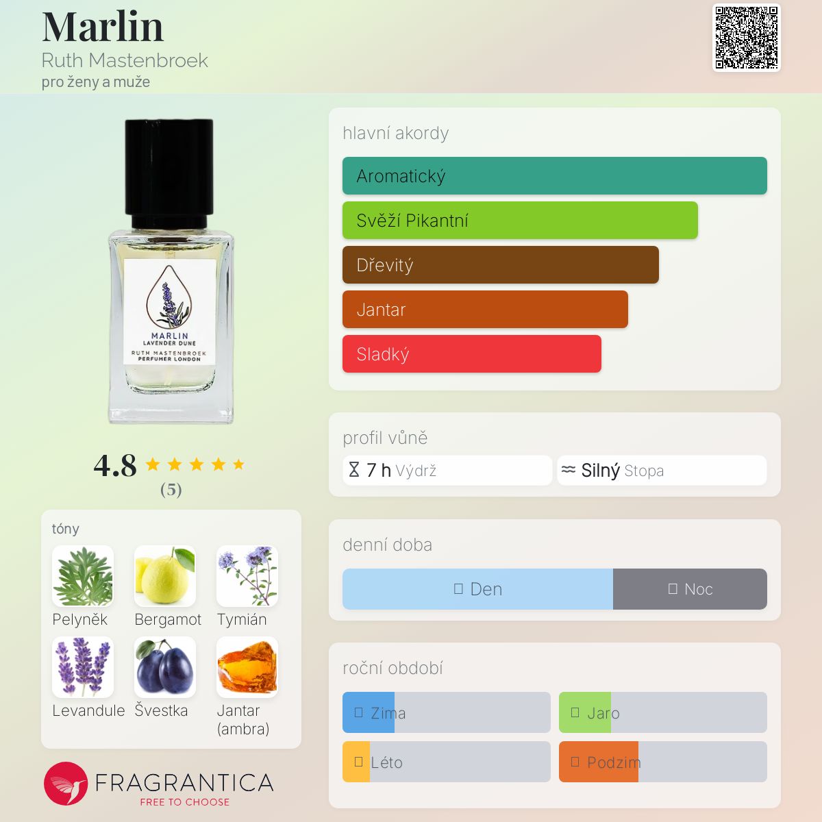 Marlin podle Ruth Mastenbroek je Aromatic Green vůně pro ženy a muže. Toto je nová vůně. Marlin byl/a uveden/a v roce 2022. "Nosem" za touto vůní je Ruth Mastenbroek. Vrchní tóny jsou Pelyněk, Bergamot a Tymián; střední tóny jsouModrá levandule, Švestka a Jantar (ambra) ; základní tóny jsou Atlasový cedr, Jedle a Fazole tonka.