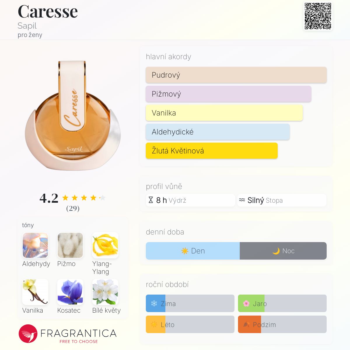 Caresse podle Sapil je Floral Aldehyde vůně pro ženy. Caresse byl/a uveden/a v roce 2023. Vrchní tóny jsou Aldehydy, Pižmo a Ylang-Ylang; střední tóny jsouBílé pižmo, Kosatec, Bílé květy a Otočník ; základní tóny jsou Vanilka, Ambrette (přírodní pižmo) a Pryskyřičné tóny.