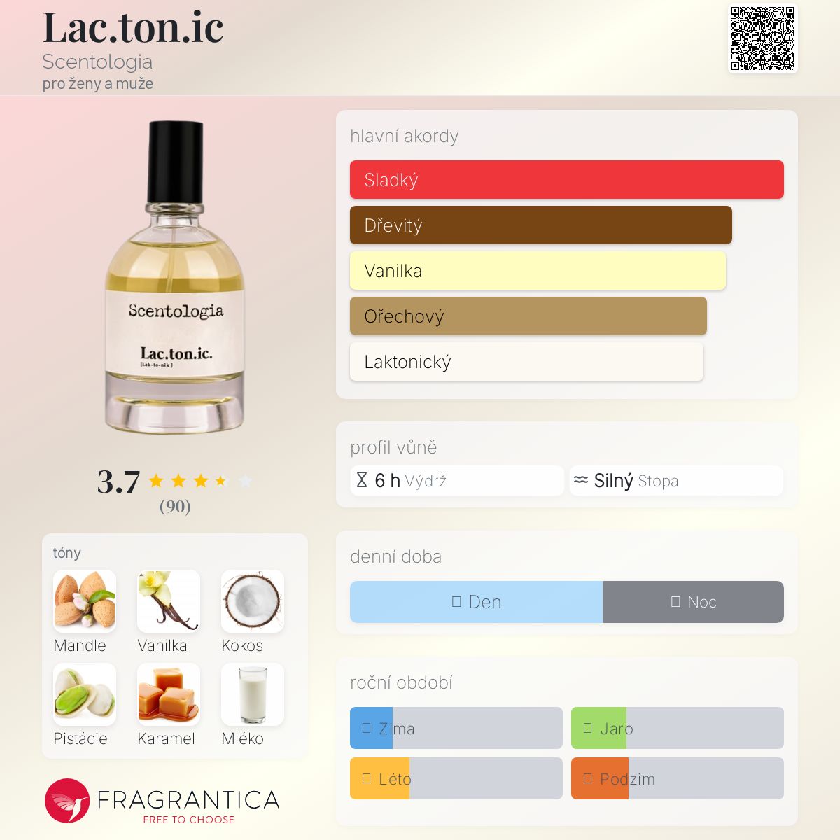 Lac.ton.ic podle Scentologia je Orientální Vanilla vůně pro ženy a muže. Toto je nová vůně. Lac.ton.ic byl/a uveden/a v roce 2025. Lac.ton.ic byl/a vytvořen/a Maurice Roucel a Margherita Carini. Vrchní tóny jsou Mandle, Kokos, Mléko, Mandarinka a Bergamot; střední tóny jsouPistácie, Ylang-Ylang a Konvalinka ; základní tóny jsou Vanilka, Karamel, Santalové dřevo a Ambrostar™.