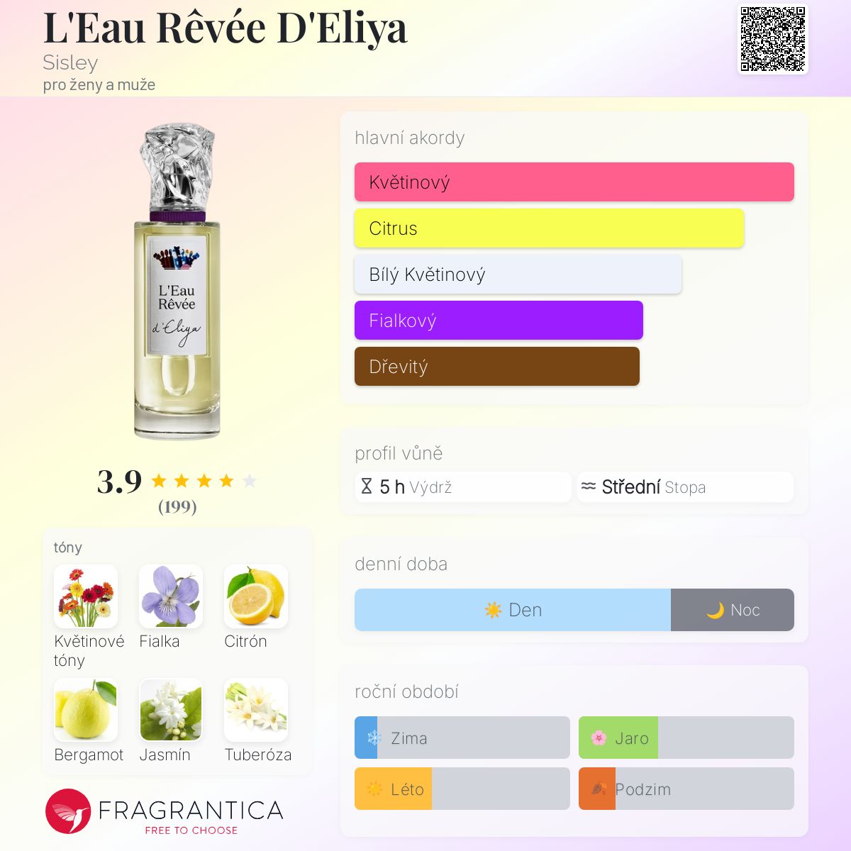 L'Eau Rêvée D'Eliya podle Sisley je vůně pro ženy a muže. L'Eau Rêvée D'Eliya byl/a uveden/a v roce 2023. "Nosem" za touto vůní je Domitille Michalon Bertier. Vrchní tóny jsou Květinové tóny, Citrón a Bergamot; střední tóny jsouFialka, Jasmín a Tuberóza ; základní tóny jsou Ambrette (přírodní pižmo), Cedr a Pačuli.