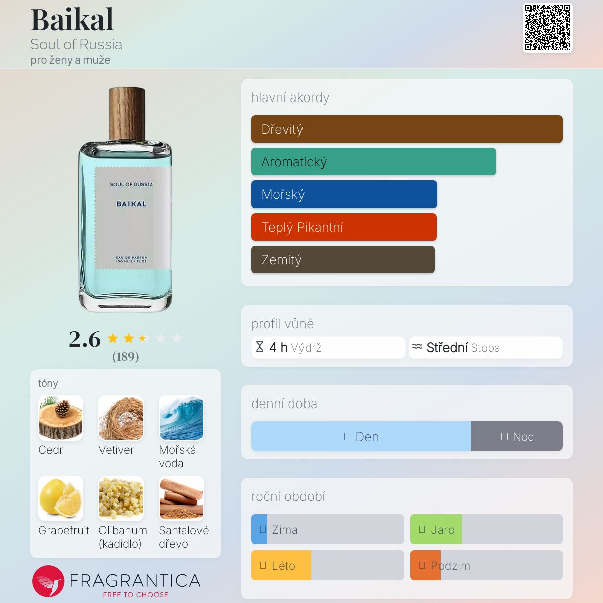 Baikal podle Soul of Russia je Woody Aquatic vůně pro ženy a muže. Baikal byl/a uveden/a v roce 2023. Vrchní tóny jsou Mořské tóny, Grapefruit a Kořeněné tóny; střední tóny jsouCedr, Rebarbora, Kosatec a Ananas ; základní tóny jsou Vetiver, Kadidlo, Santalové dřevo a Pačuli.