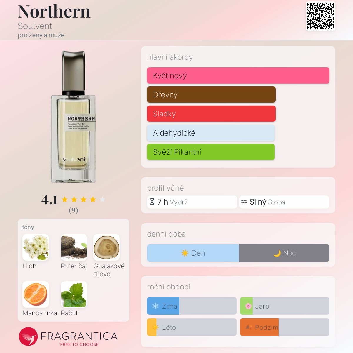 Northern podle Soulvent je Orientální Woody vůně pro ženy a muže. Toto je nová vůně. Northern byl/a uveden/a v roce 2024. "Nosem" za touto vůní je Ciny Ye. Vrchní tón je Hloh ; střední tóny jsouPu'er čaj a Mandarinka ; základní tóny jsou Guajakové dřevo a Pačuli. Tento parfém je vítězem oceněníArt and Olfaction Awards 2025 .