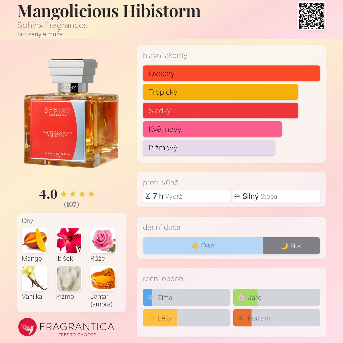 Mangolicious Hibistorm podle Sphinx Fragrances je Floral Woody Musk vůně pro ženy a muže. Toto je nová vůně. Mangolicious Hibistorm byl/a uveden/a v roce 2024. Vrchní tóny jsou Mango, Ibišek a Červené bobule; střední tóny jsouRůže, Vanilka a Pižmo ; základní tóny jsou Jantar (ambra), Agarové dřevo (oud) a Kůže.