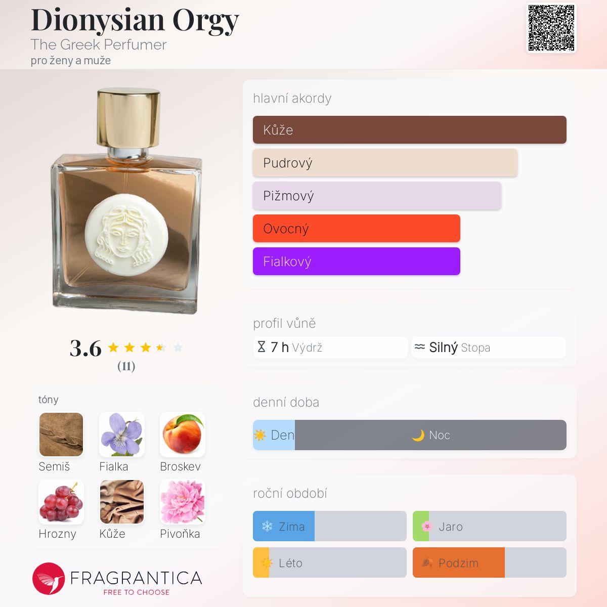 Dionysian Orgy podle The Greek Perfumer je Orientální Spicy vůně pro ženy a muže. Dionysian Orgy byl/a uveden/a v roce 2023. Vrchní tóny jsou Broskev, Hrozny a Citrón; střední tóny jsouSemiš, Fialka a Pivoňka ; základní tóny jsou Kůže, Pižmo, Vanilka a Pačuli.
